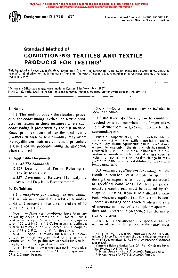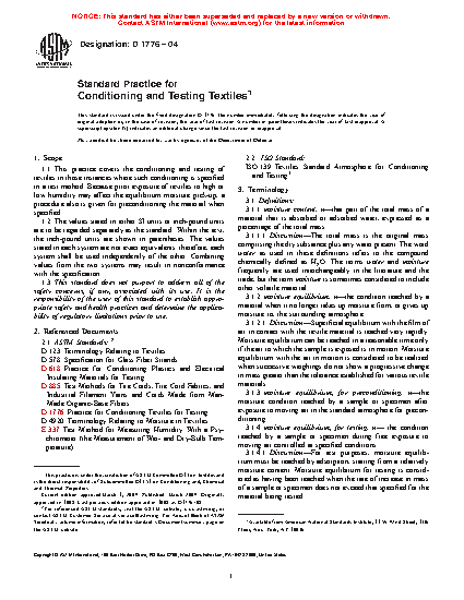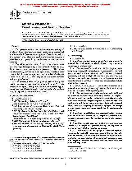 1.1 This practice covers the conditioning and testing of textiles when conditioning is specified in a test method. Because prior exposure of textiles to high or low humidity may affect moisture pick-up equilibrium, a procedure also is given for preconditioning the material when required.