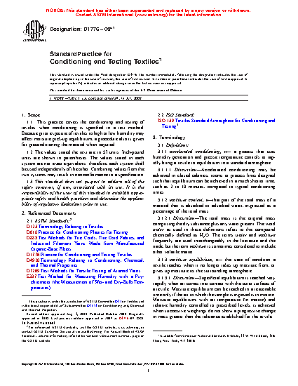 1.1 This practice covers the conditioning and testing of textiles when conditioning is specified in a test method. Because prior exposure of textiles to high or low humidity may affect moisture pick-up equilibrium, a procedure also is given for preconditioning the material when required.