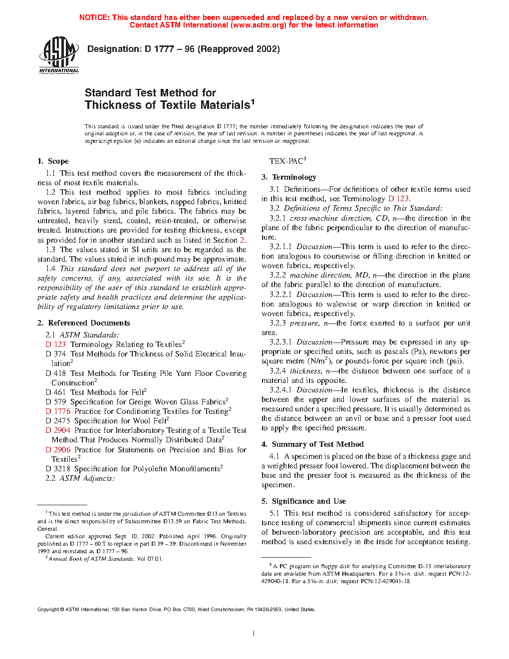 5.4 When using this test method for measuring the thickness of textile materials, the primary method for the specific material such as listed in the Referenced Document section shall take precedence over the directions described in this test method, unless specifically provided for in that test method. This test method is used in its entirety when no test method for measuring thickness is available for the specific material to be tested or unless otherwise specified in a material specification or contract order.
