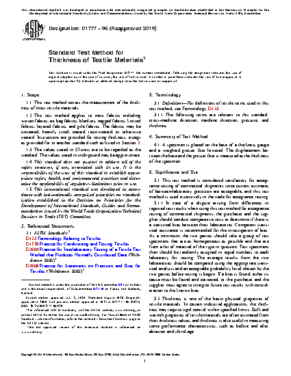 1.1 This test method covers the measurement of the thickness of most textile materials.
