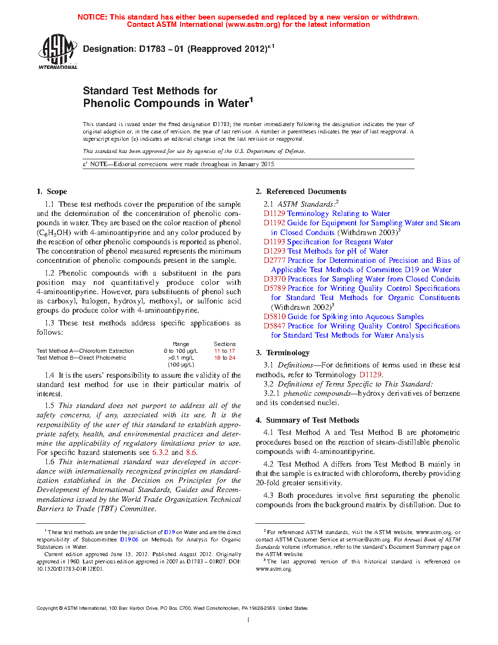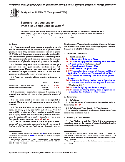 1.1 These test methods cover the preparation of the sample and the determination of the concentration of phenolic compounds in water. They are based on the color reaction of phenol (C6H5OH) with 4-aminoantipyrine and any color produced by the reaction of other phenolic compounds is reported as phenol. The concentration of phenol measured represents the minimum concentration of phenolic compounds present in the sample.