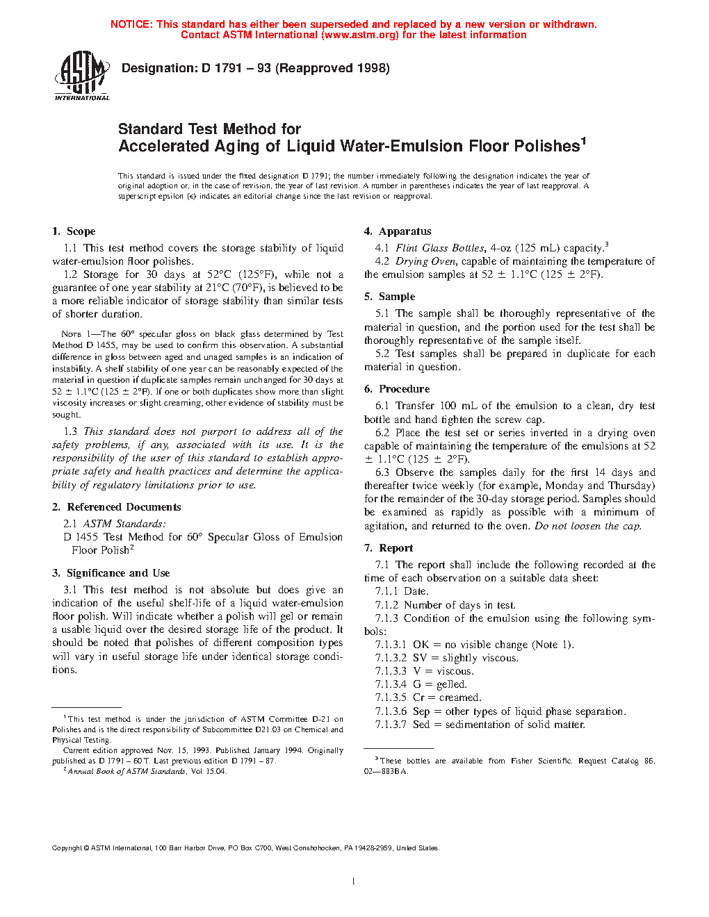 Note-The 60° specular gloss on black glass determined by Test Method D1455, may be used to confirm this observation. A substantial difference in gloss between aged and unaged samples is an indication of instability. A shelf stability of one year can be reasonably expected of the material in question if duplicate samples remain unchanged for 30 days at 52 + 1.1°C (125 + 2°F). If one or both duplicates show more than slight viscosity increases or slight creaming, other evidence of stability must be sought.1.3 This standard does not purport to address all of the safety problems, if any, associated with its use. It is the responsibility of the user of this standard to establish appropriate safety and health practices and determine the applicability of regulatory limitations prior to use.