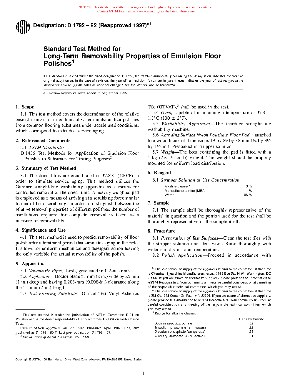 This test method is used to predict removability of floor polish after a treatment period that simulates aging in the field. It allows for uniform mechanical and detergent action leaving the only variable the actual removability of the polish.