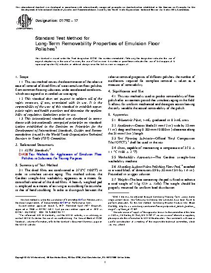 1.1 This test method covers the determination of the relative ease of removal of dried films of water-emulsion floor polishes from common flooring substrates under accelerated conditions, which correspond to extended service aging.