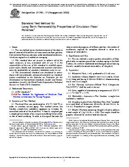 1.1 This test method covers the determination of the relative ease of removal of dried films of water-emulsion floor polishes from common flooring substrates under accelerated conditions, which correspond to extended service aging.