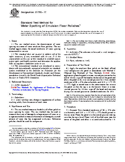 1.1 This test method covers the determination of water spotting resistance of water emulsion floor polishes. The test method approximates the actual conditions of water spotting encountered in service.