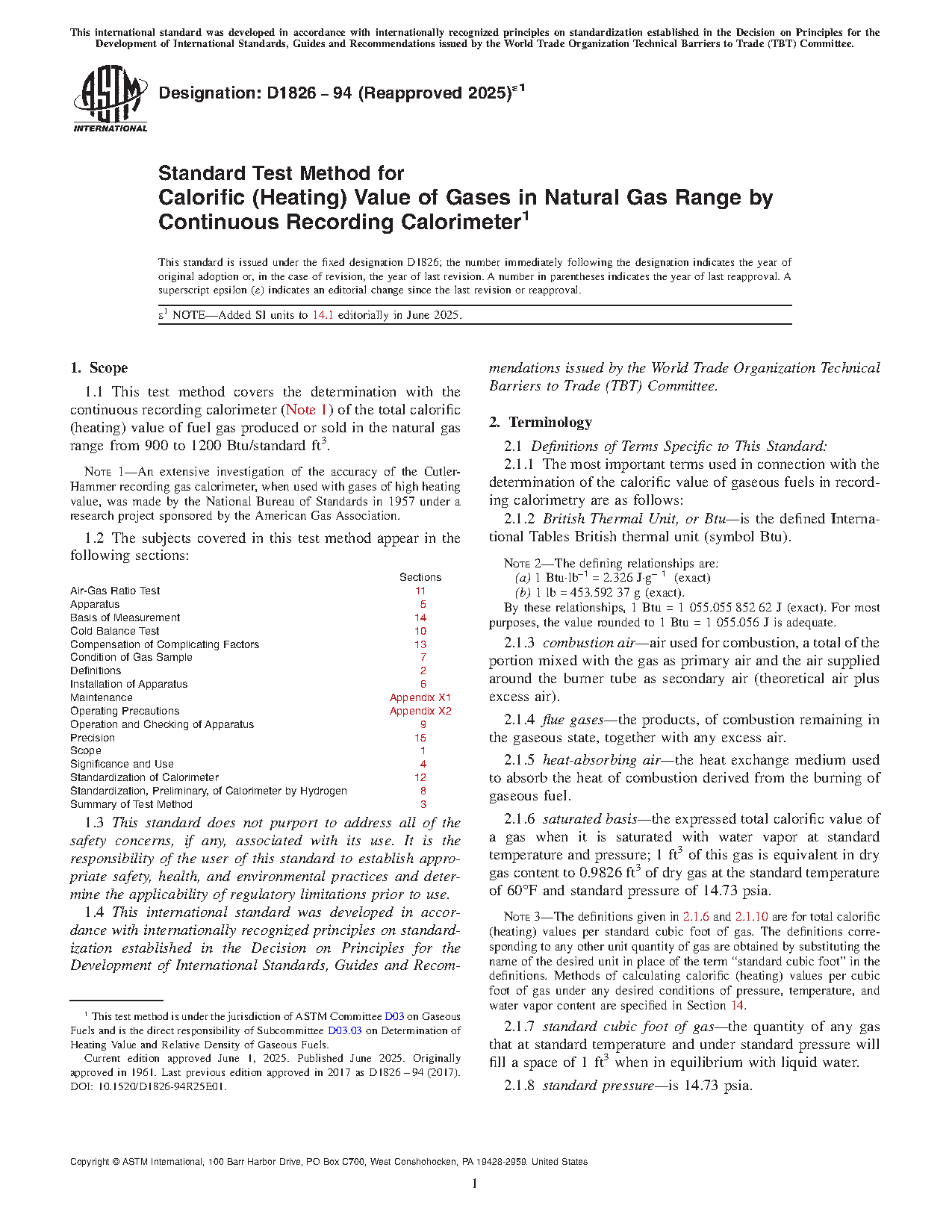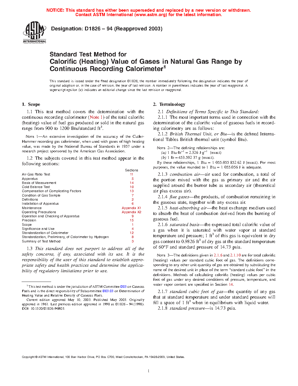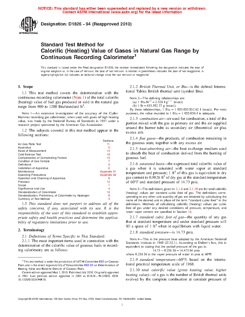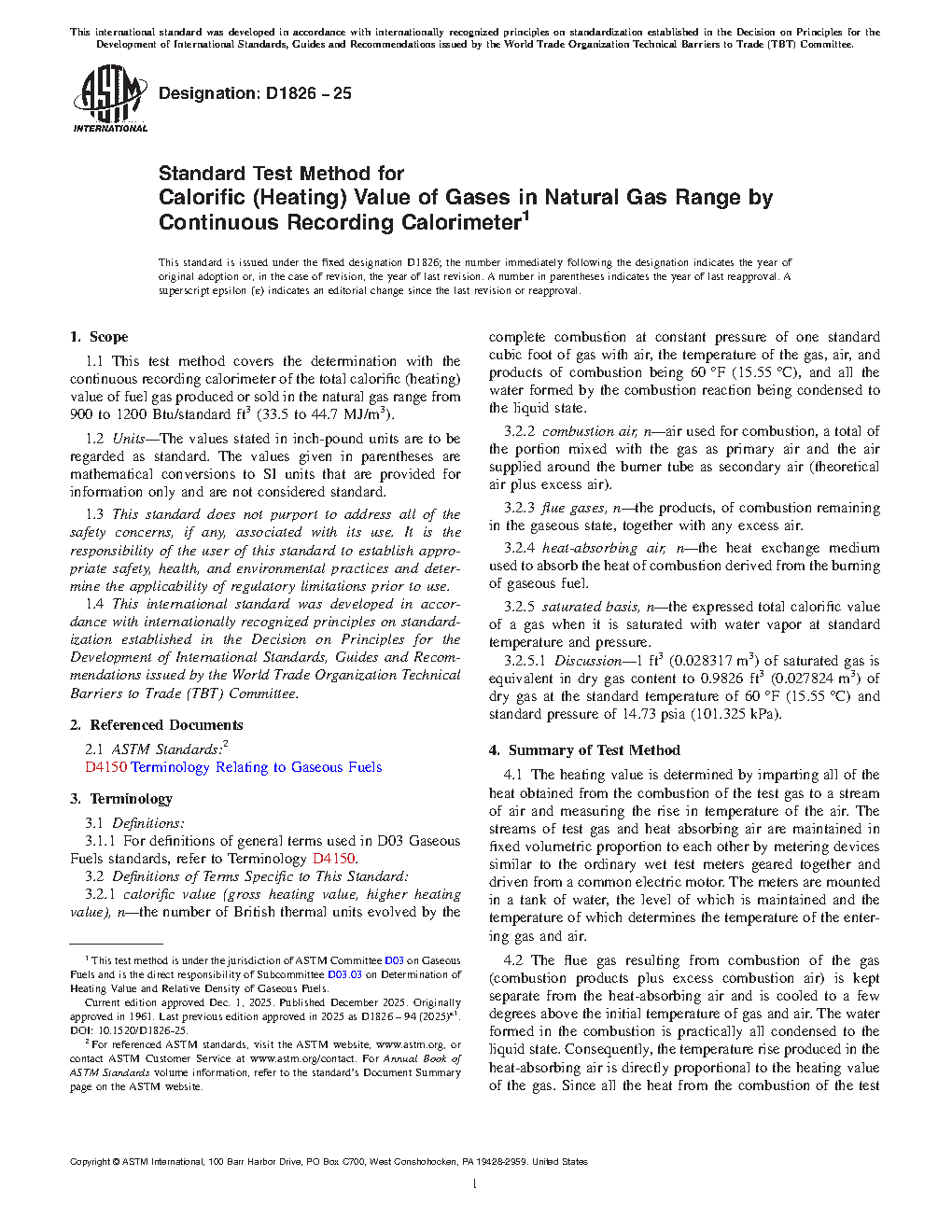 1.1 This test method covers the determination with the continuous recording calorimeter (Note 1) of the total calorific (heating) value of fuel gas produced or sold in the natural gas range from 900 to 1200 Btu/standard ft3.