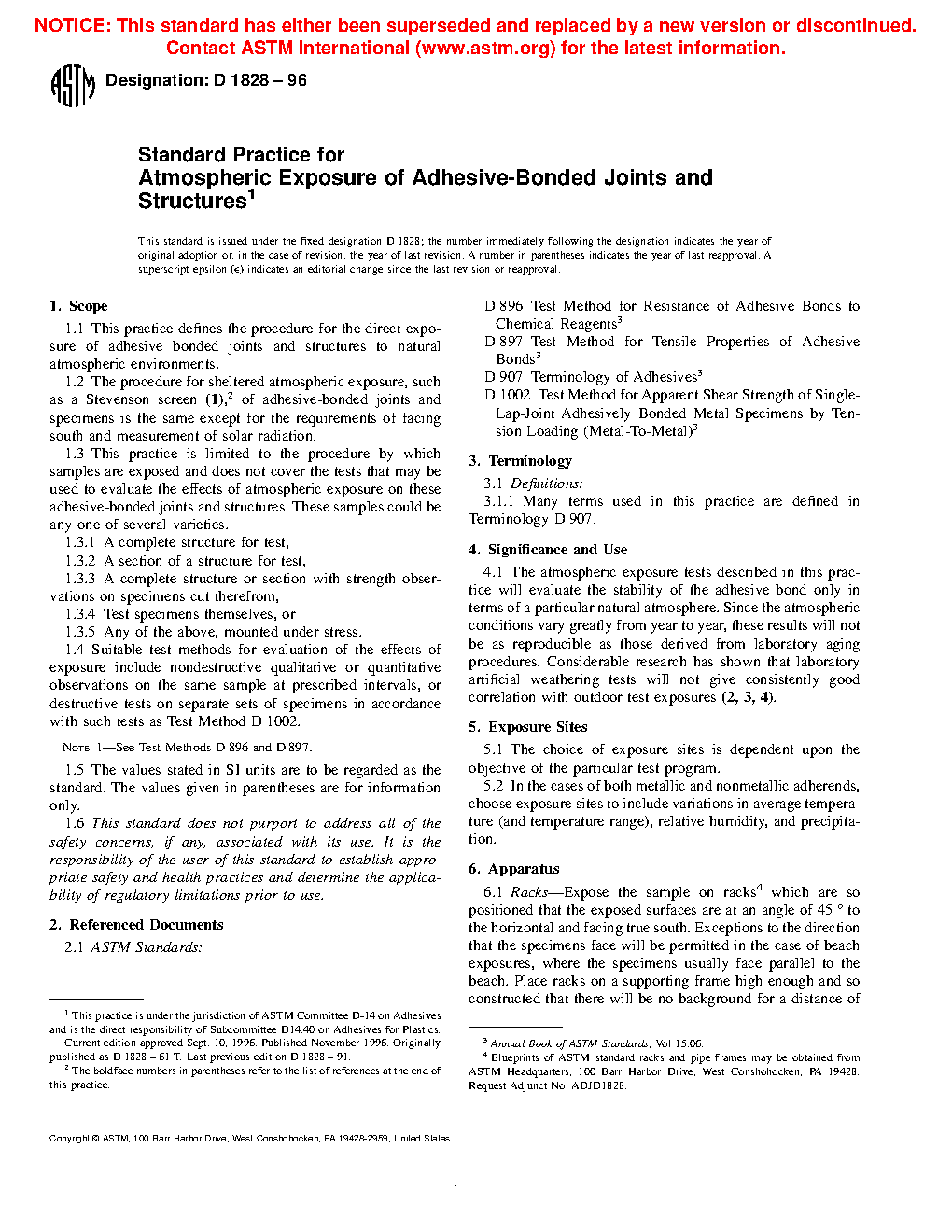 1.4 Suitable test methods for evaluation of the effects of exposure include nondestructive qualitative or quantitative observations on the same sample at prescribed intervals, or destructive tests on separate sets of specimens in accordance with such tests as Test Method D 1002. Note 1 - See Test Methods D 896 and D 897.