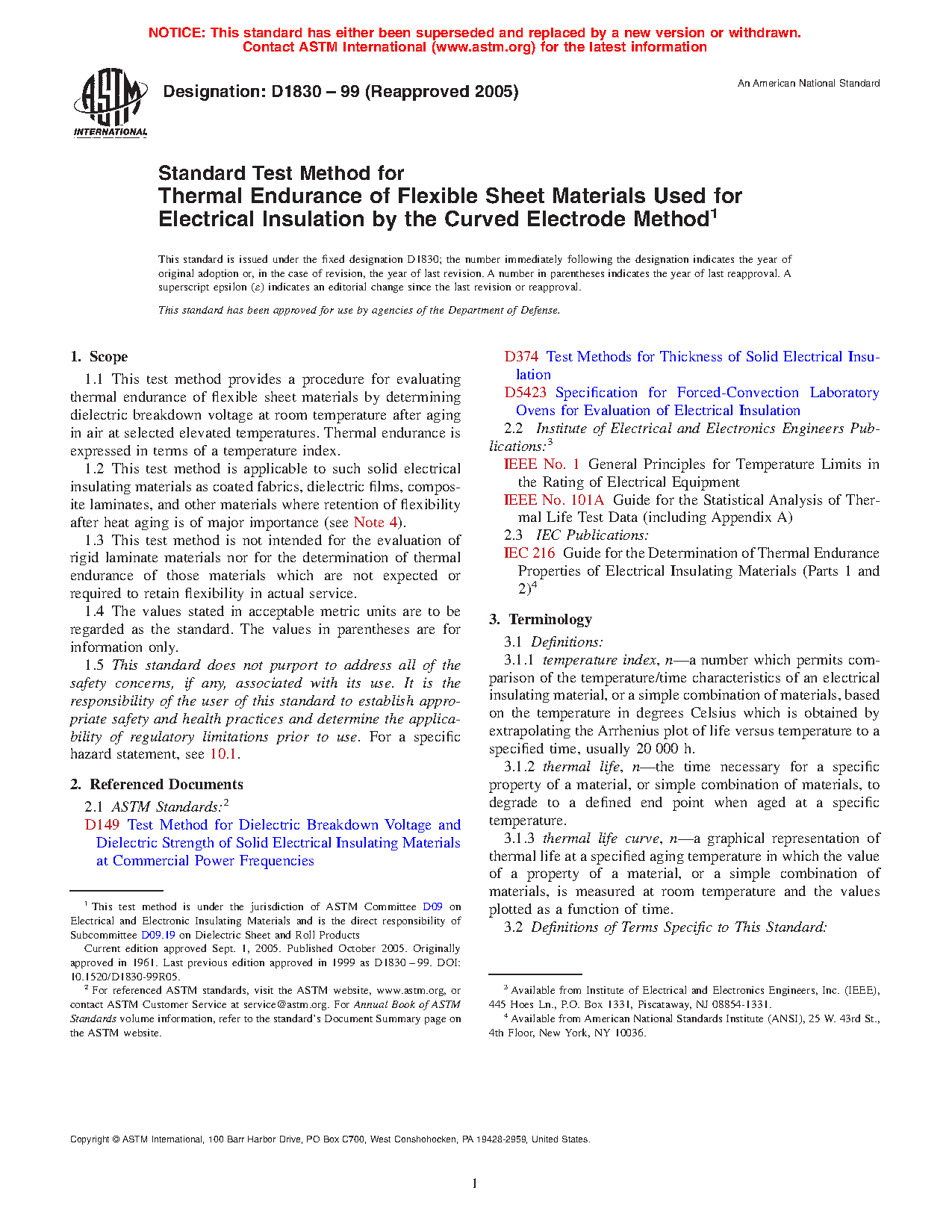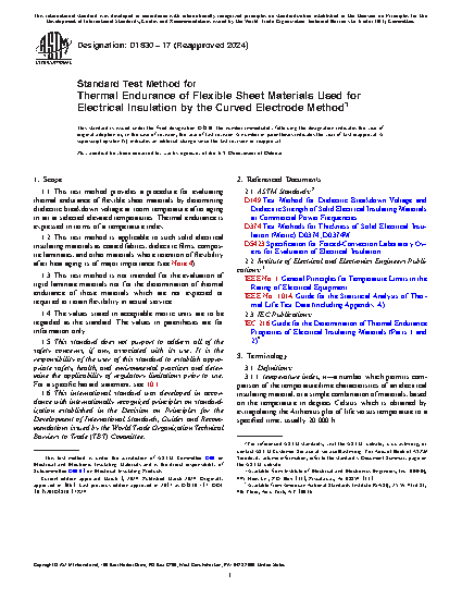 1.1 This test method provides a procedure for evaluating thermal endurance of flexible sheet materials by determining dielectric breakdown voltage at room temperature after aging in air at selected elevated temperatures. Thermal endurance is expressed in terms of a temperature index.
