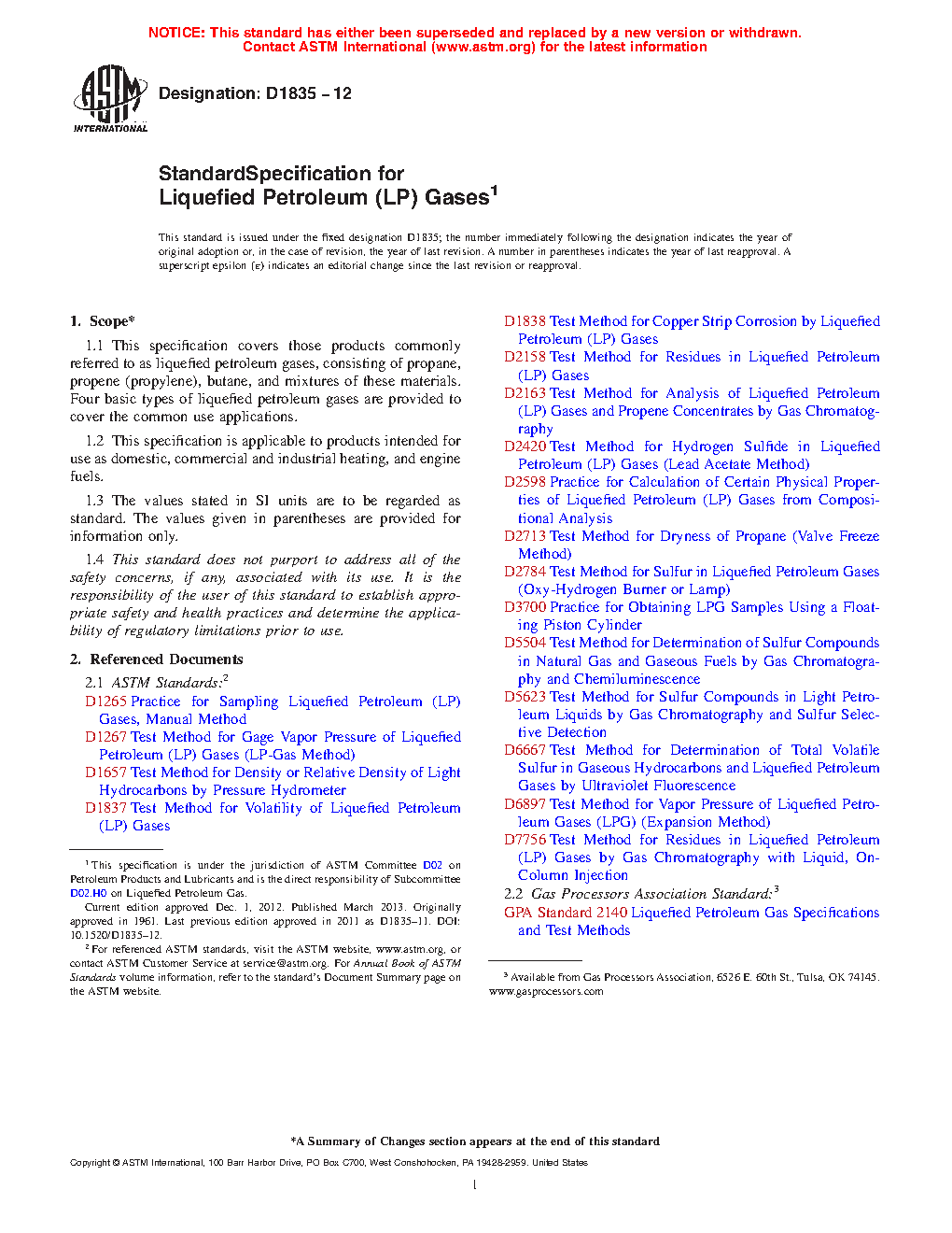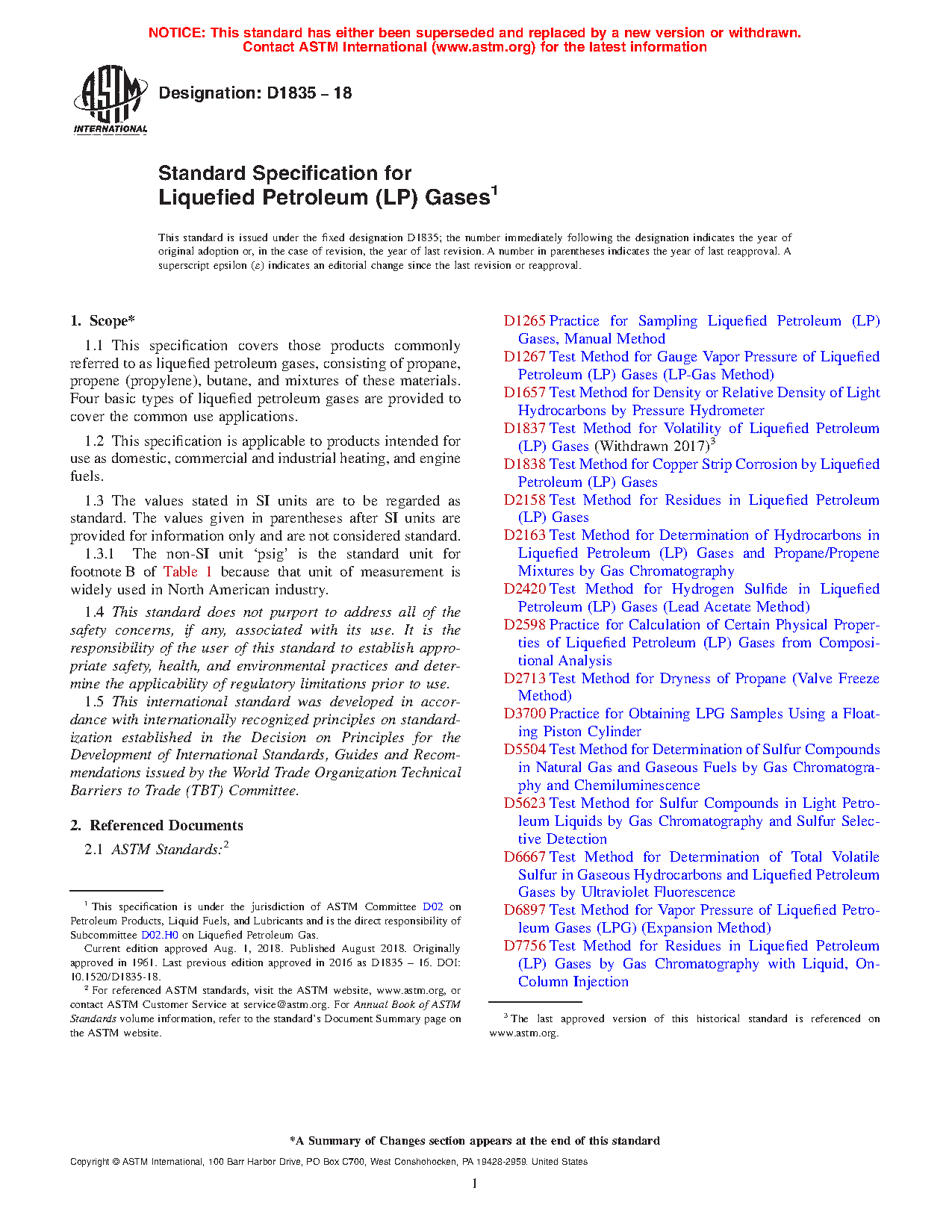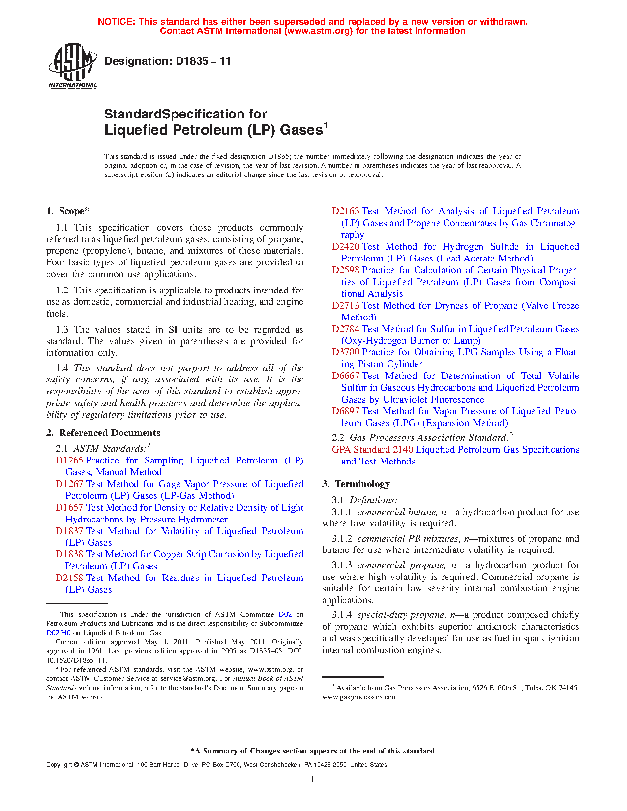 This specification covers liquefied petroleum gases consisting of propane, propene (propylene), butane, and mixtures of these materials. The products are intended for use as domestic, commercial and industrial heating, and engine fuels. Care must be taken to in sampling of the liquefied gases for test results to be significant. All four types of liquefied petroleum gases covered by this specification should conform to the specified requirements for vapor pressure, volatile residue, residue matter, relative density, and corrosion.