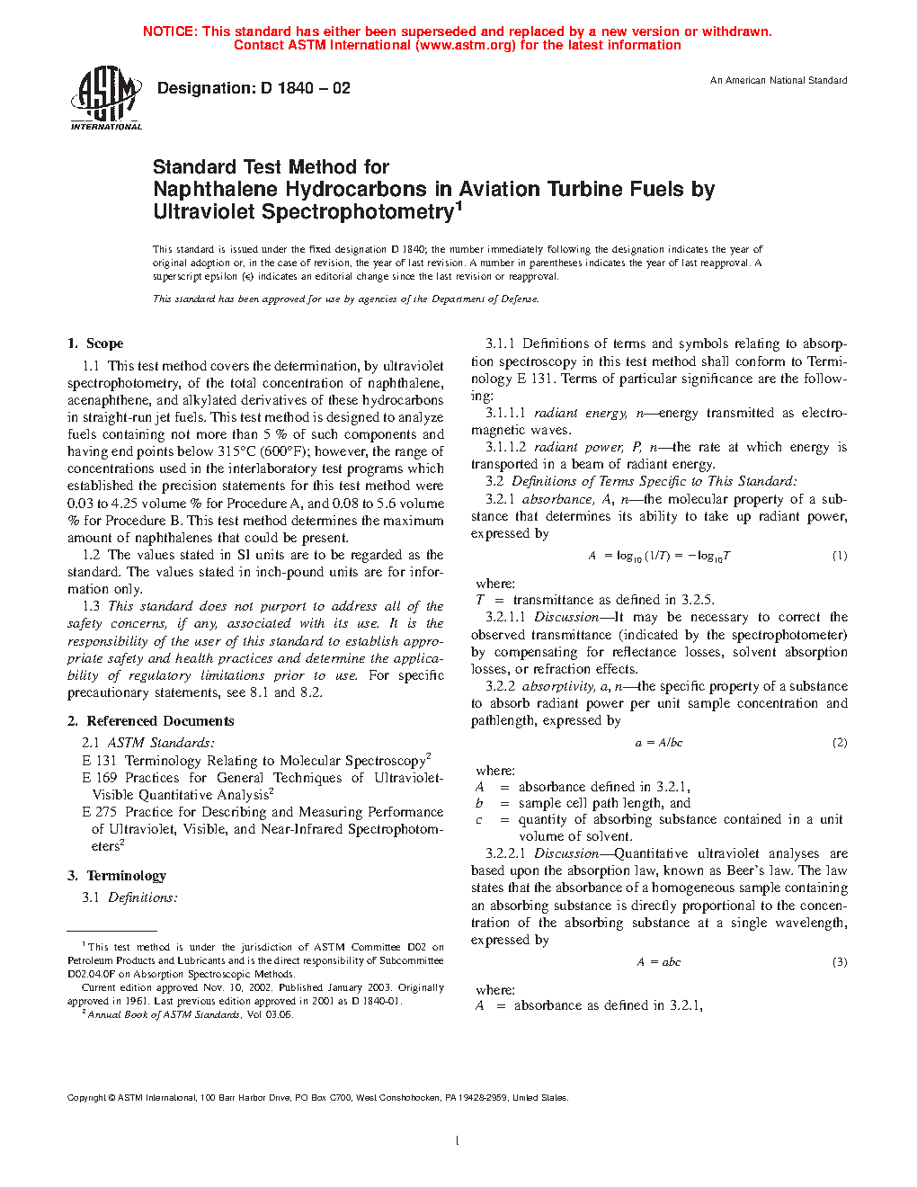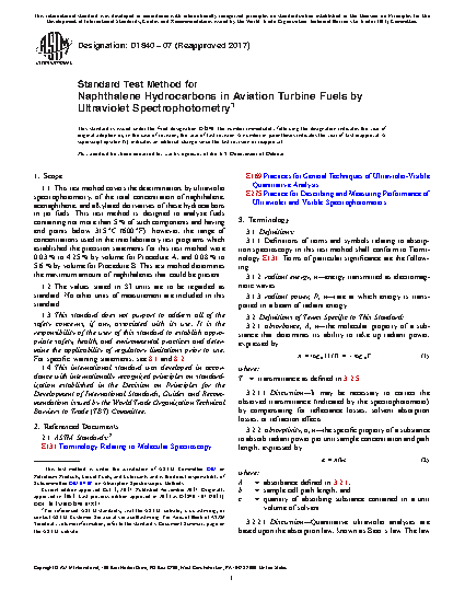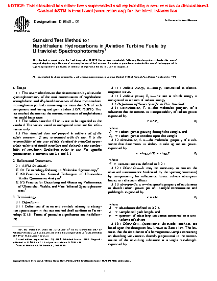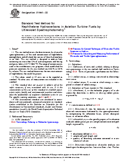 1.1 This test method covers the determination, by ultraviolet spectrophotometry, of the total concentration of naphthalene, acenaphthene, and alkylated derivatives of these hydrocarbons in jet fuels. This test method is designed to analyze fuels containing not more than 5 % of such components and having end points below 315 °C (600 °F). The range of concentrations used in the interlaboratory test programs which established the precision statements for this test method was 0.08 % to 5.6 % by volume. This test method determines the maximum amount of naphthalenes that could be present.