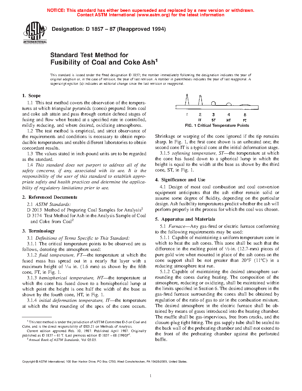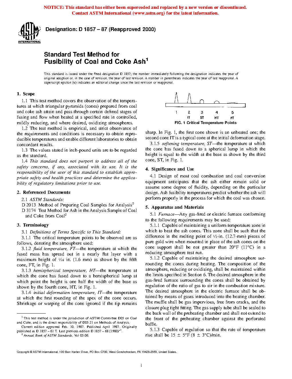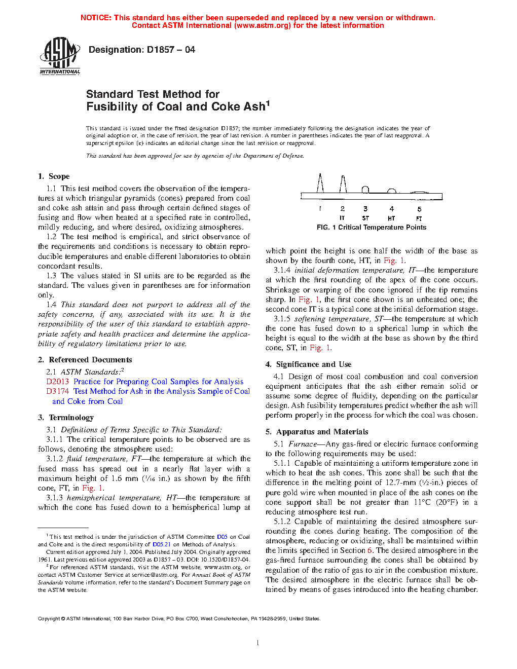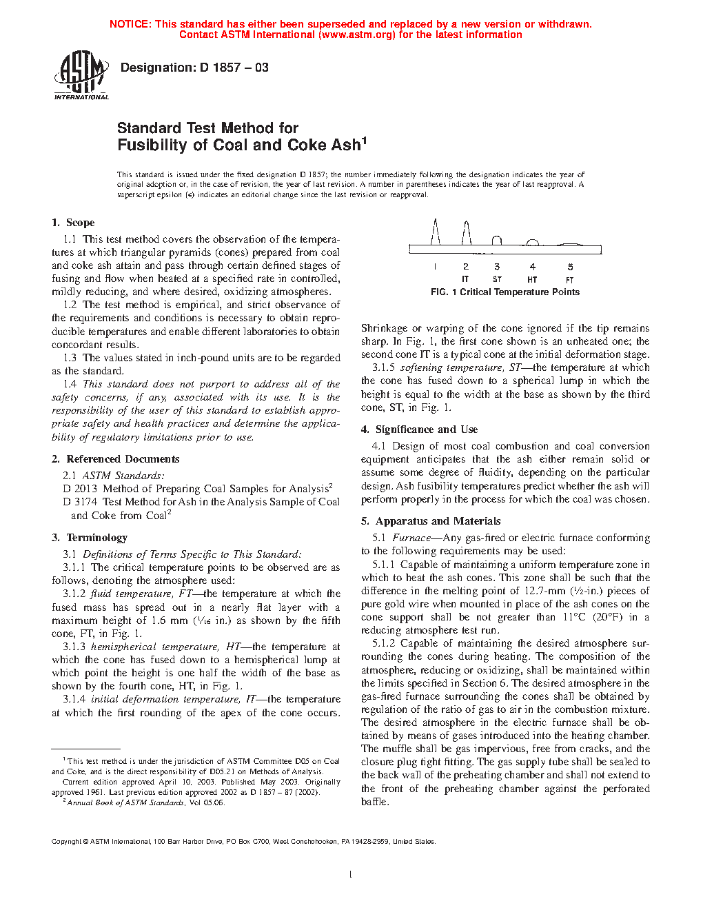 1.1 This test method covers the observation of the temperatures at which triangular pyramids (cones) prepared from coal and coke ash attain and pass through certain defined stages of fusing and flow when heated at a specified rate in controlled, mildly reducing, and where desired, oxidizing atmospheres.