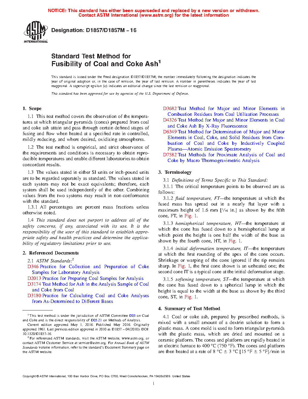 1.1 This test method covers the observation of the temperatures at which triangular pyramids (cones) prepared from coal and coke ash attain and pass through certain defined stages of fusing and flow when heated at a specified rate in controlled, mildly reducing, and where desired, oxidizing atmospheres.