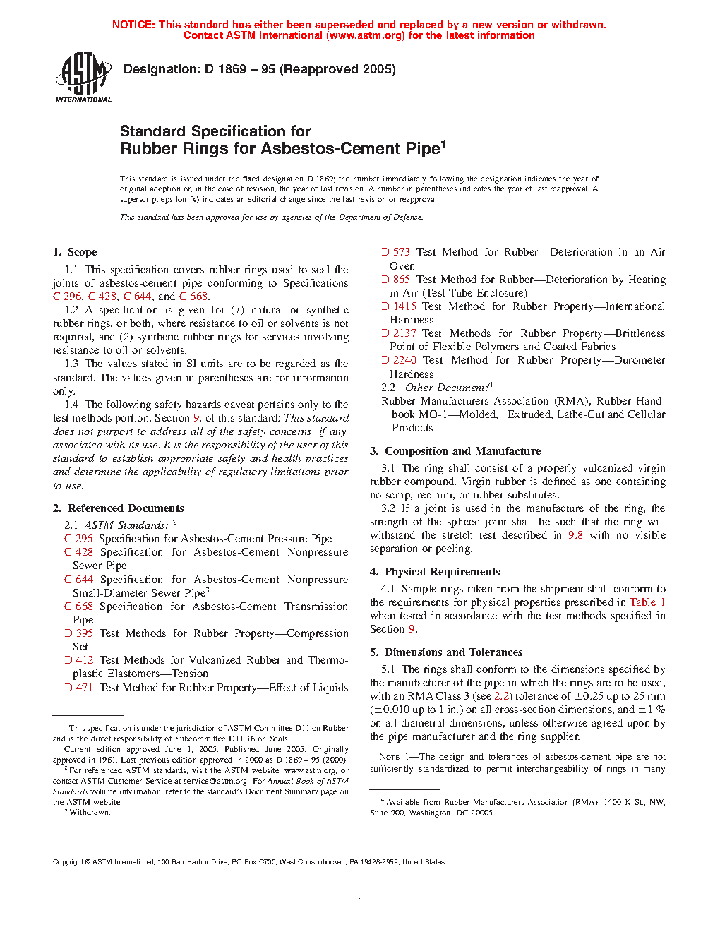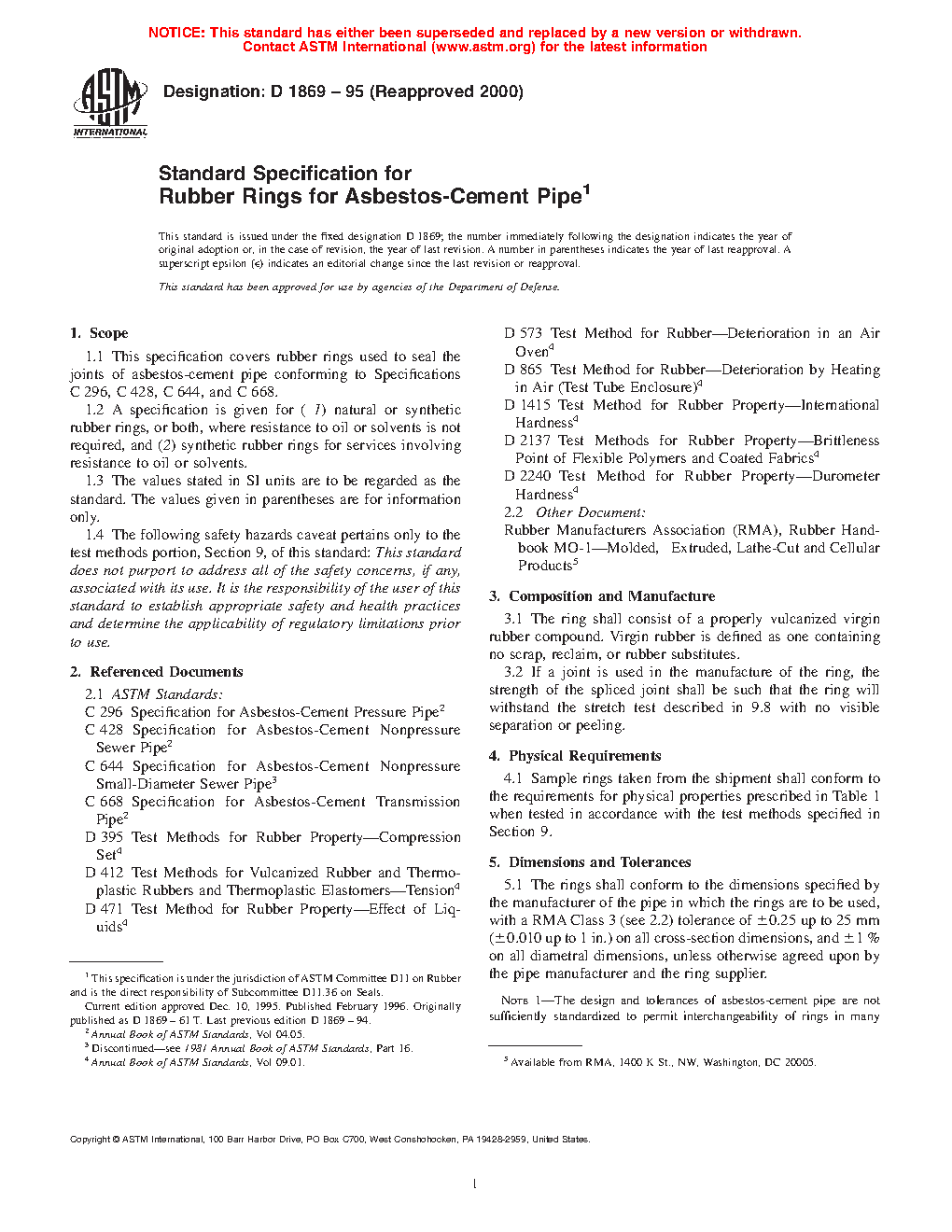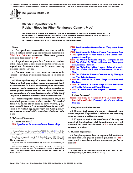 This specification covers rubber rings used as seals for asbestos-cement pipe joints. Material under this specification consists of natural or synthetic rubber rings, or both, for use in applications requiring non-oil resistant rings, and synthetic rubber rings for use in applications requiring oil-resistant rings. The ring shall be manufactured from a properly vulcanized virgin rubber compound, that is, rubber containing no scrap, reclaim, or rubber substitutes, with dimensions that shall conform to the requirements specified. The ring must also possess a surface that is smooth and free of pitting, cracks, blisters, air marks, and other imperfections, and a body free of porosity and air pockets. Tests for tensile strength, elongation, stress at elongation, hardness, compression set, low-temperature flexibility, volume change, and appearance change shall be performed and shall conform to the requirements specified.