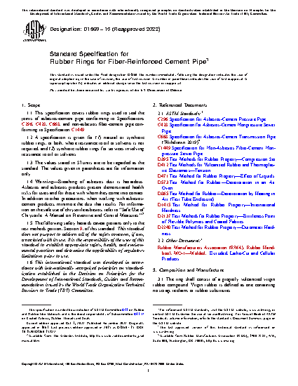 1.1 This specification covers rubber rings used to seal the joints of asbestos-cement pipe conforming to Specifications C296, C428, C668, and non-asbestos fiber-cement pipe conforming to Specification C1449.
