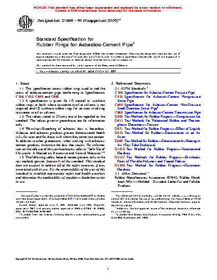 1.4 Warning—Breathing of asbestos dust is hazardous. Asbestos and asbestos products present demonstrated health risks for users and for those with whom they come into contact. In addition to other precautions, when working with asbestos-cement products, minimize the dust that results. For information on the safe use of chrysotile asbestos, refer to “Safe Use of Chrysotile: A Manual on Preventive and Control Measures.”2