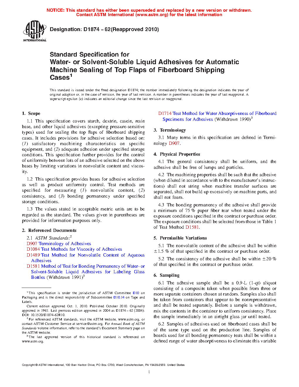 1.1 This specification covers starch, dextrin, casein, resin base, and other liquid adhesives (excepting pressure-sensitive types) used for sealing the top flaps of fiberboard shipping cases. It includes provisions for adhesive selection based on: (1) satisfactory machining characteristics on specific equipment, and (2) adequate adhesion under specified storage conditions. This specification further provides for the control of uniformity between lots of an adhesive selected on the above bases by limiting variations in nonvolatile content and viscosity.