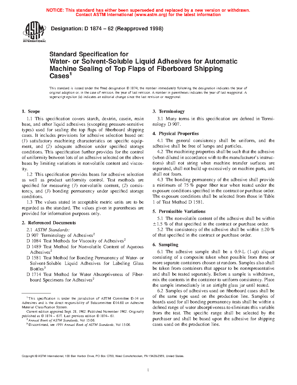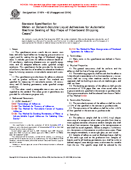 1.1 This specification covers starch, dextrin, casein, resin base, and other liquid adhesives (excepting pressure-sensitive types) used for sealing the top flaps of fiberboard shipping cases. It includes provisions for adhesive selection based on: (1) satisfactory machining characteristics on specific equipment, and (2) adequate adhesion under specified storage conditions. This specification further provides for the control of uniformity between lots of an adhesive selected on the above bases by limiting variations in nonvolatile content and viscosity.