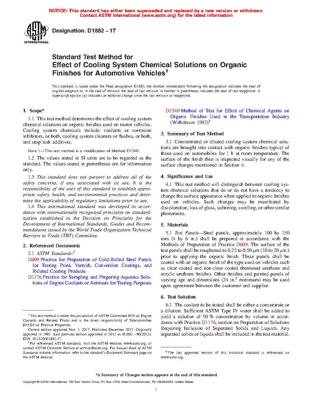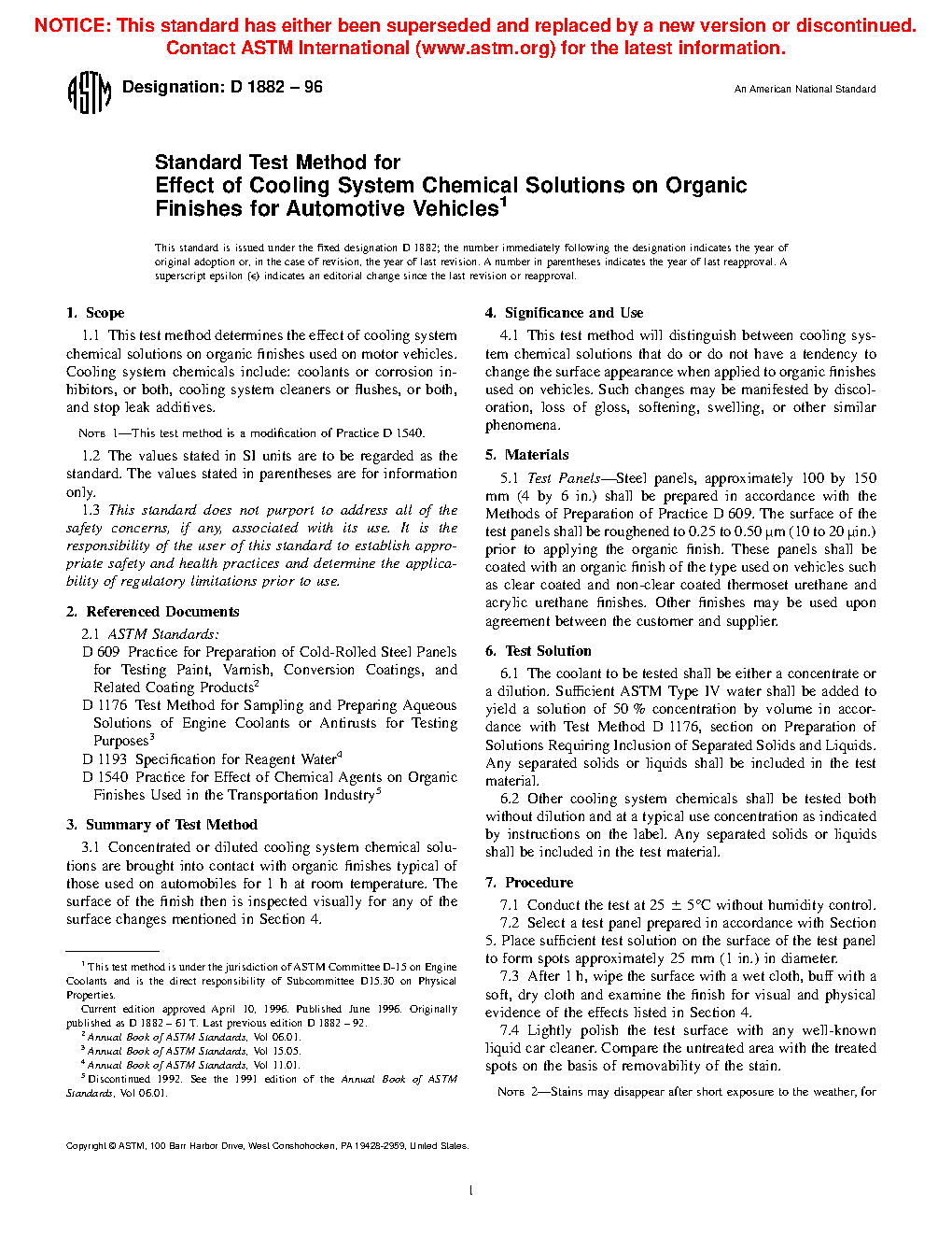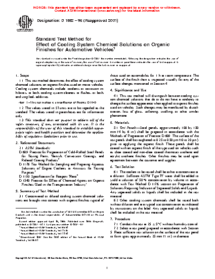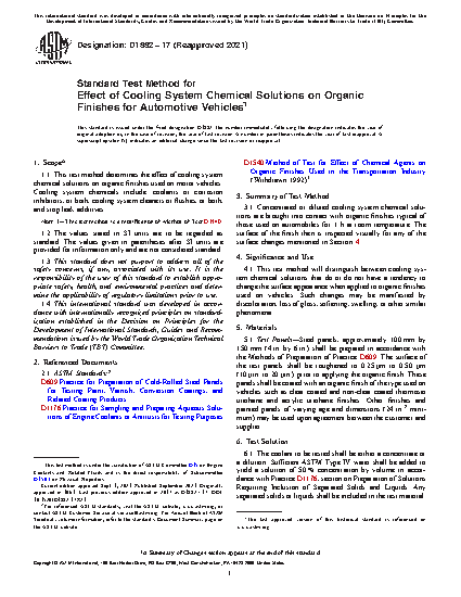 4.1 This test method will distinguish between cooling system chemical solutions that do or do not have a tendency to change the surface appearance when applied to organic finishes used on vehicles. Such changes may be manifested by discoloration, loss of gloss, softening, swelling, or other similar phenomena.