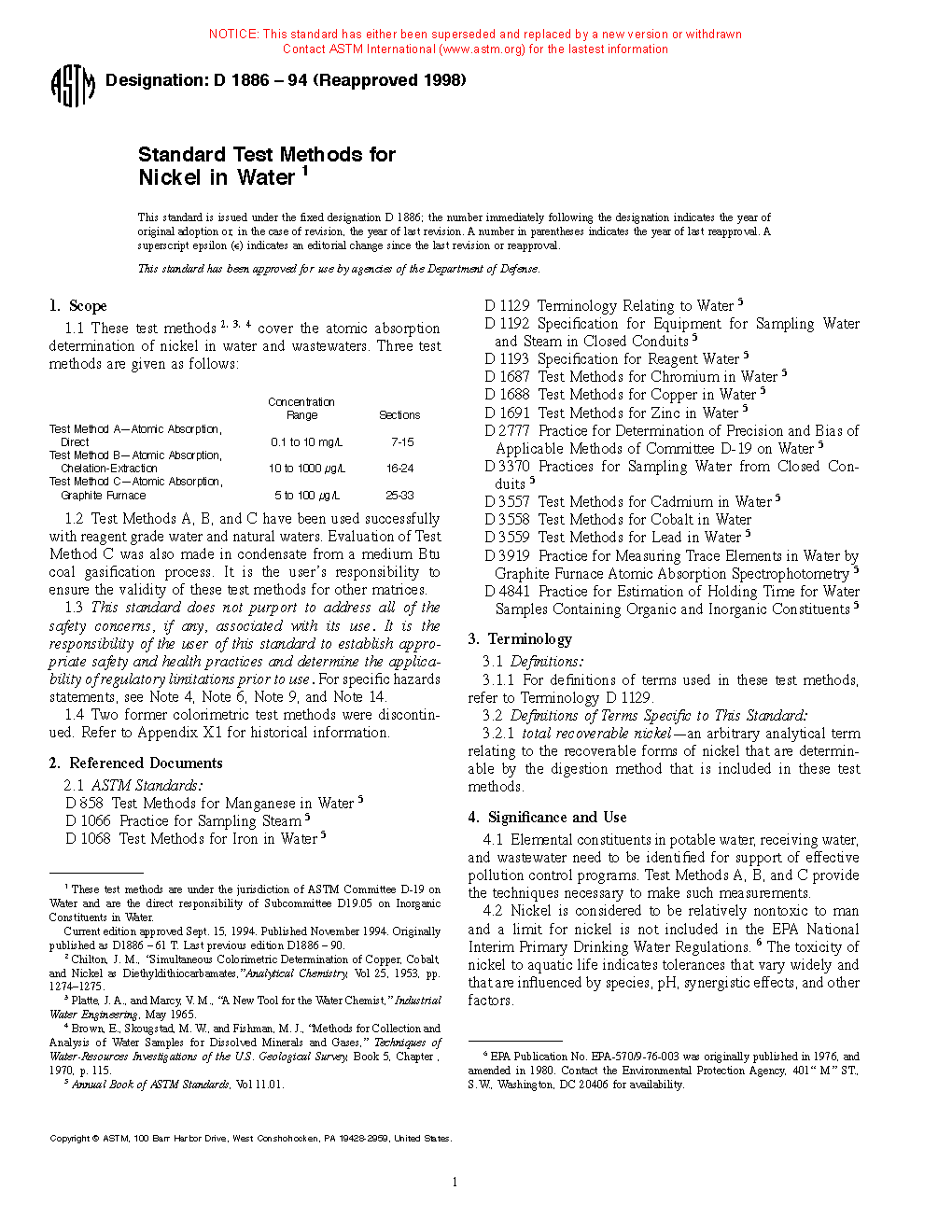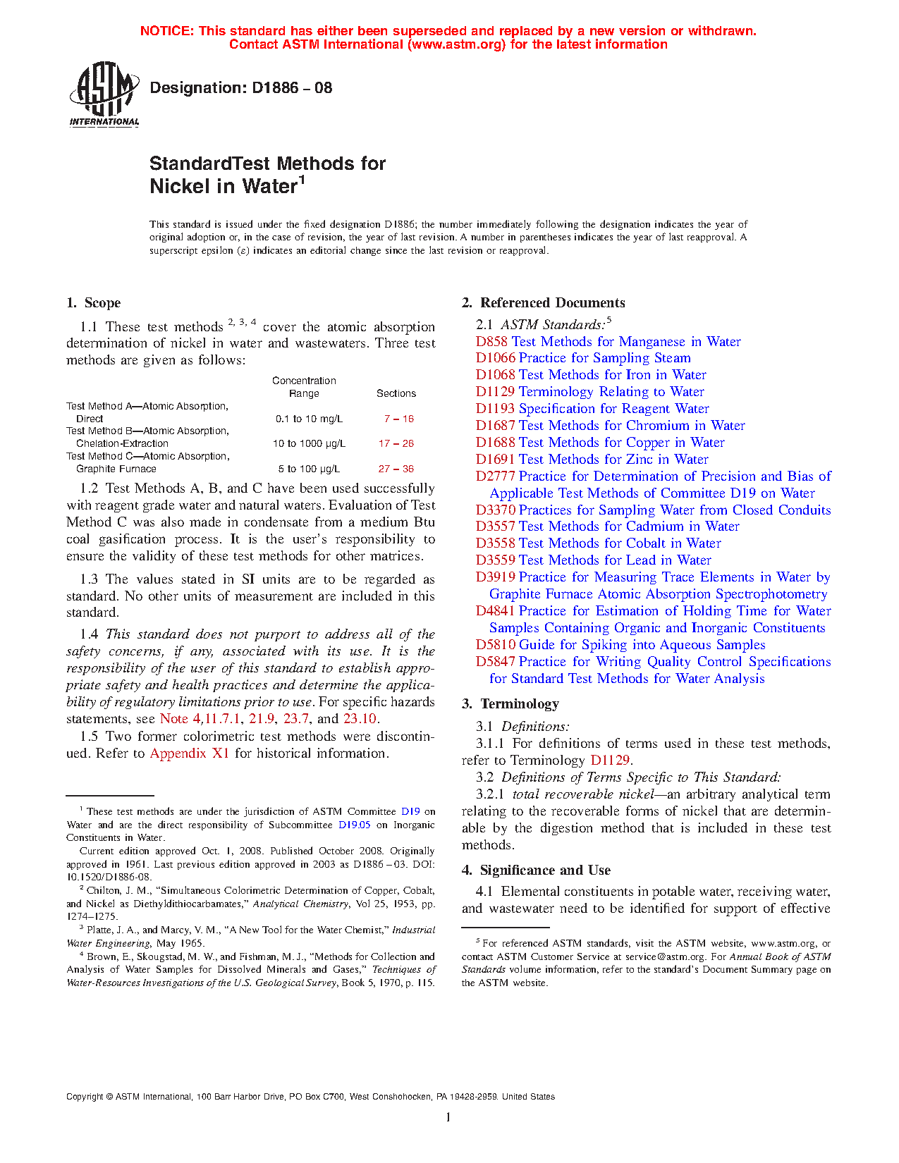 ^KEYWORDS: atomic absorption; chelation; graphite furnace; nickel; water^INDEX TERMS: Inorganic compounds--water; Nickel content--water; Spectrophotometry--atomic absorption (water/wastewater); Wastewater testing/treatment ^STATUS: Dn Cn Sn Nn Mn ^APPROVAL: 20081001 ^PAGES: 11 ^COMMITTEE: D19 ^SUBCOMMITTEE: 0500 ^BOS: 11.01 ^ORGINFO: DOD ^ACTION: STD_REVISION ^MISCPUB: ^PDESIG: D1886 ^PYEAR: 2008 ^CLASS: Test Method