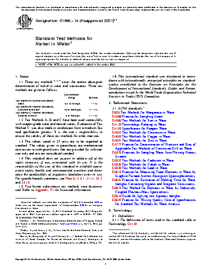 1.1 These test methods , , cover the atomic absorption determination of nickel in water and wastewaters. Three test methods are given as follows: