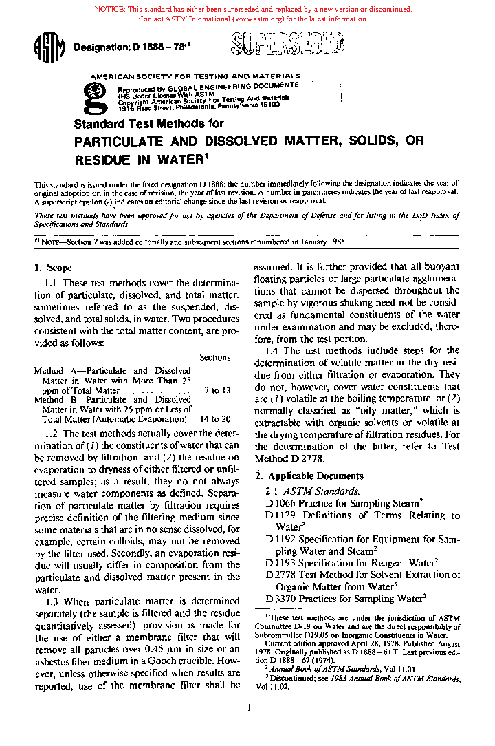 Methods of Test for Particulate and Dissolved Matter in Water (Withdrawn 1989)