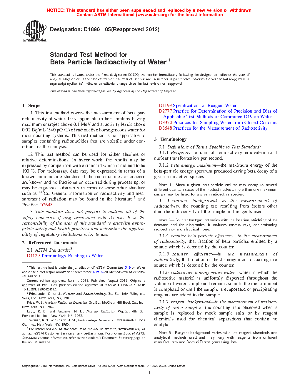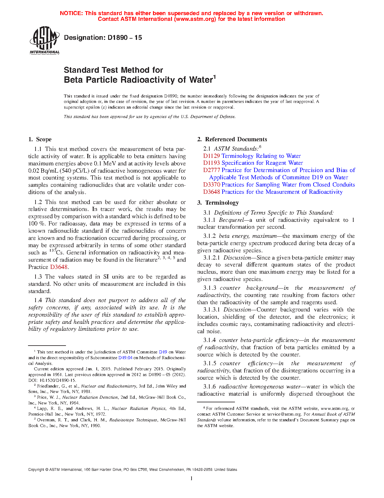 1.1 This test method covers the measurement of beta particle activity of water. It is applicable to beta emitters having maximum energies above 0.1 MeV and at activity levels above 0.02 Bq/mL (540 pCi/L) of radioactive homogeneous water for most counting systems. This test method is not applicable to samples containing radionuclides that are volatile under conditions of the analysis.