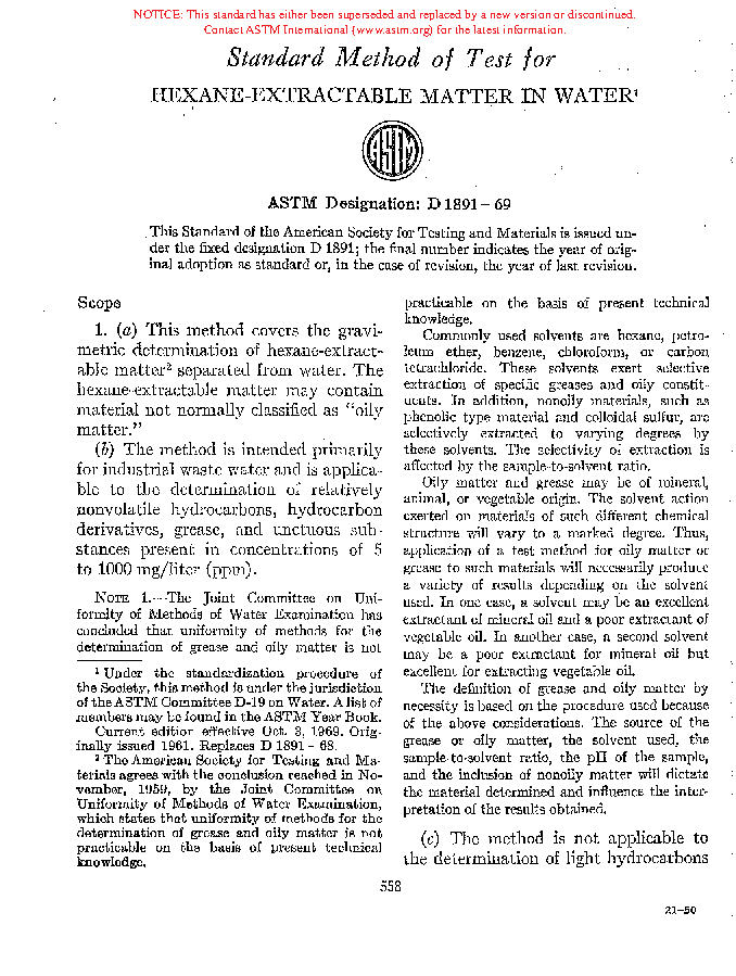 Method of Test for Hexane-Extractable Matter in Industrial Waste Water (Withdrawn 1970)