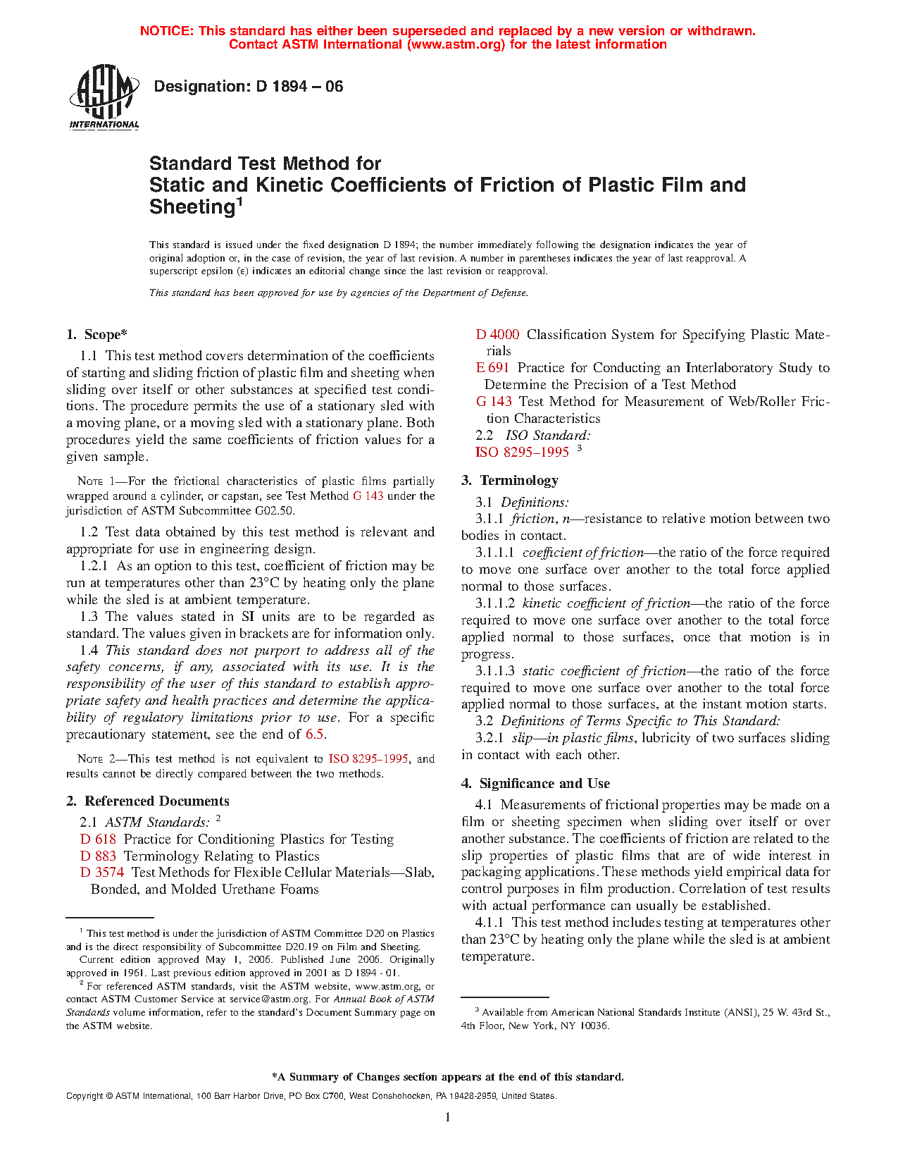 Note 1—For the frictional characteristics of plastic films partially wrapped around a cylinder, or capstan, see Test Method G143 under the jurisdiction of ASTM Subcommittee G02.50.