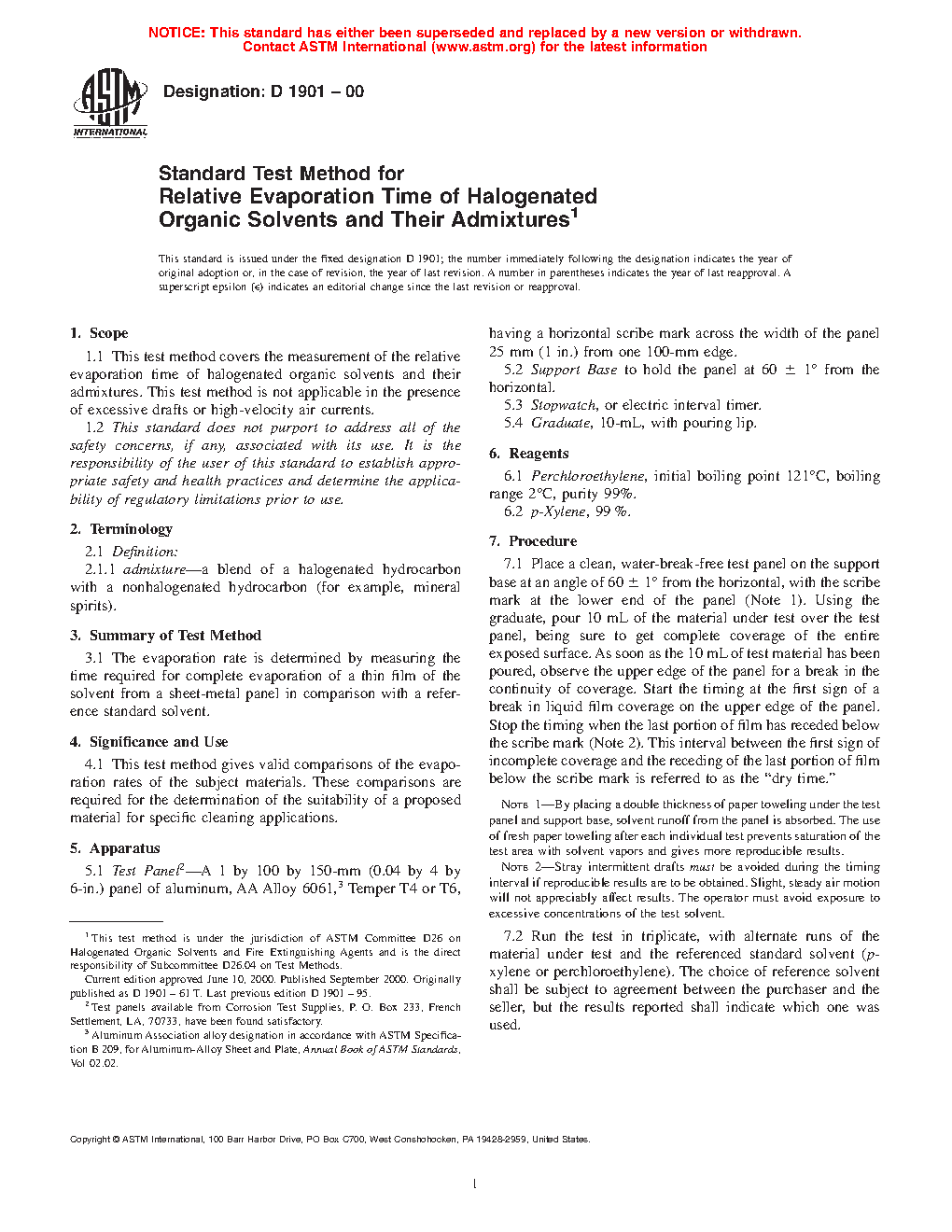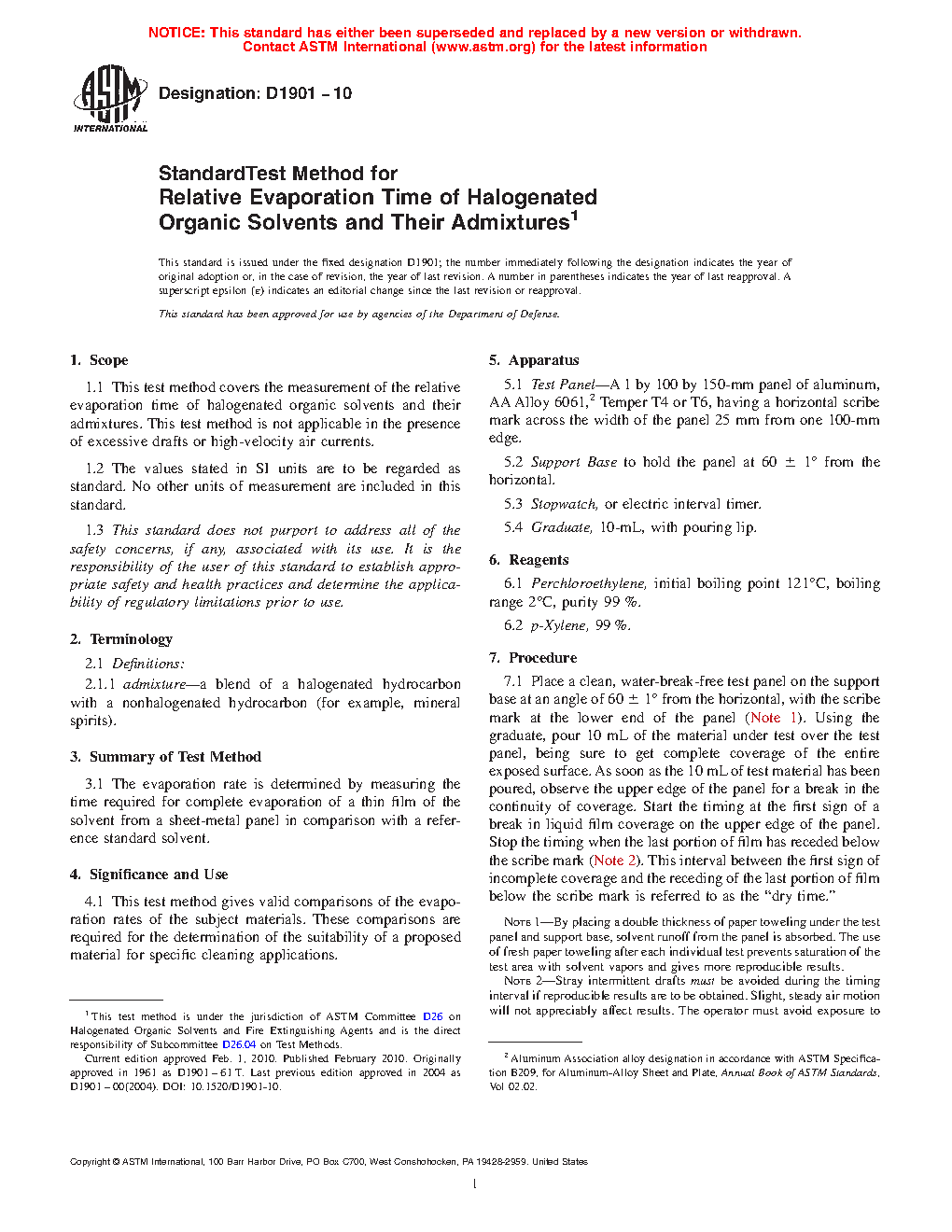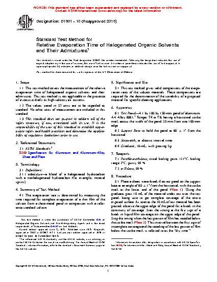 1.1 This test method covers the measurement of the relative evaporation time of halogenated organic solvents and their admixtures. This test method is not applicable in the presence of excessive drafts or high-velocity air currents.