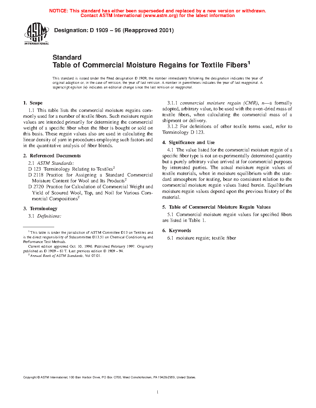 1.1 This table lists the commercial moisture regains commonly used for a number of textile fibers. Such moisture regain values are intended primarily for determining the commercial weight of a specific fiber when the fiber is bought or sold on this basis. These regain values also are used in calculating the linear density of yarn in procedures employing such factors and in the quantitative analysis of fiber blends.
