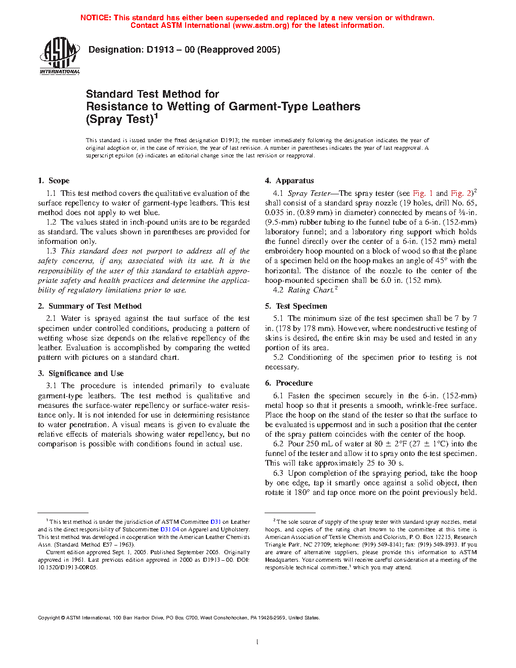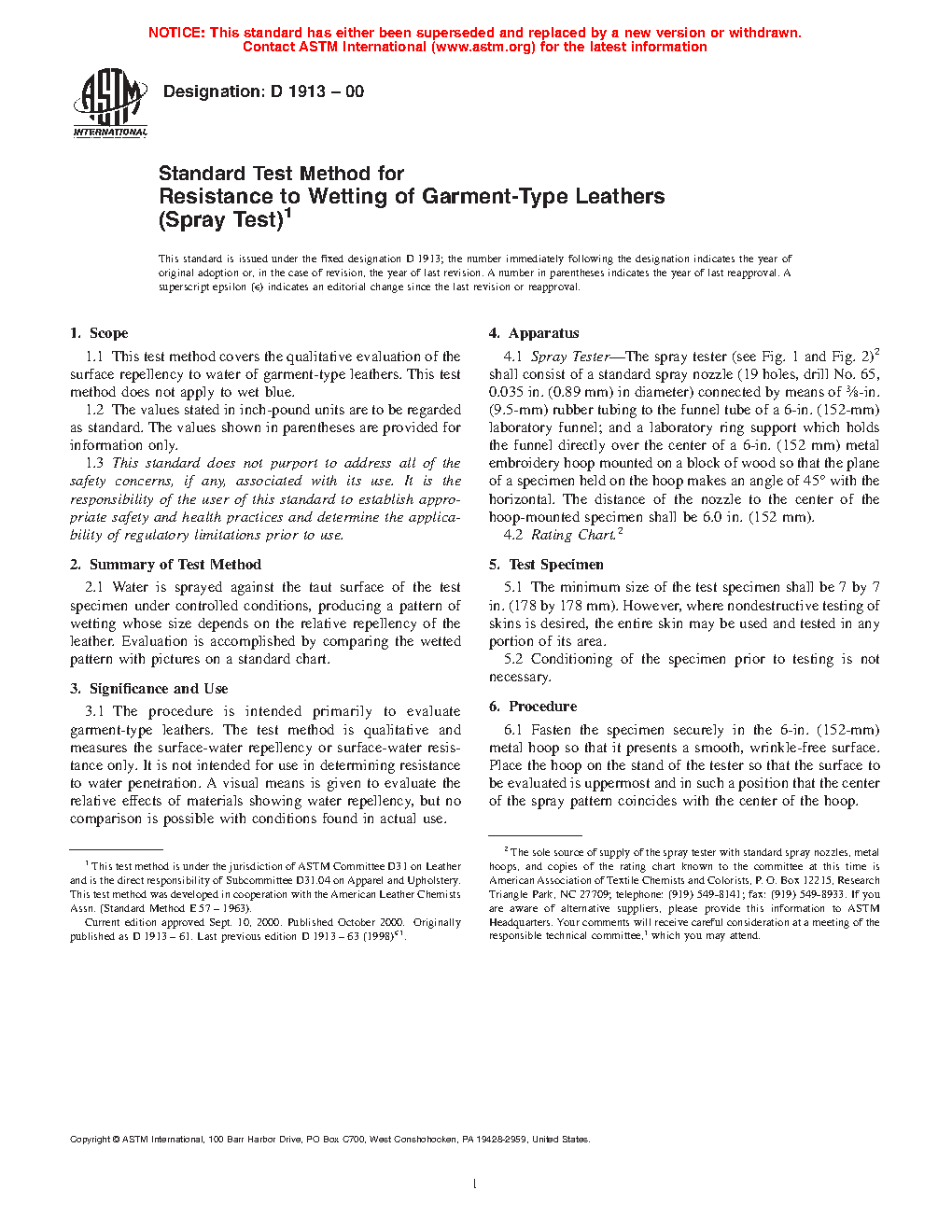 1.1 This test method covers the qualitative evaluation of the surface repellency to water of garment-type leathers. This test method does not apply to wet blue.