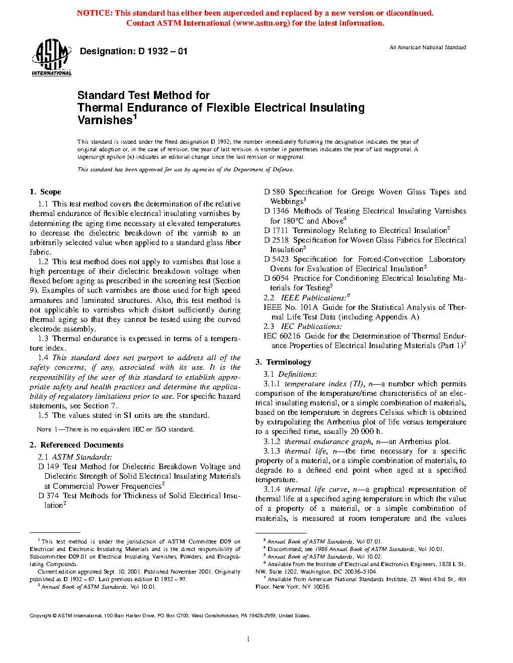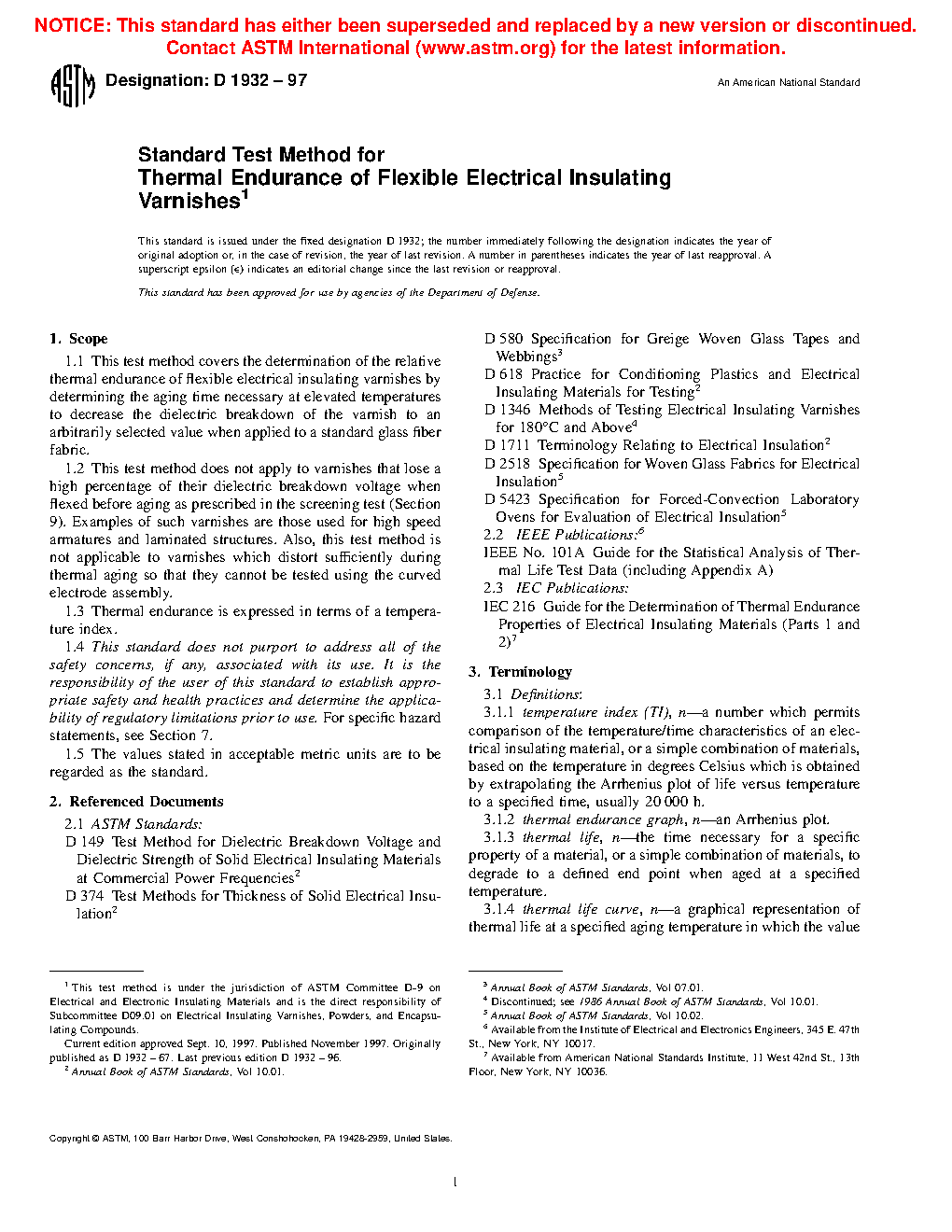 1.1 This test method covers the determination of the relative thermal endurance of flexible electrical insulating varnishes by determining the time necessary at elevated temperatures to decrease the dielectric breakdown of the varnish to an arbitrarily selected value when applied to a standard glass fiber fabric.