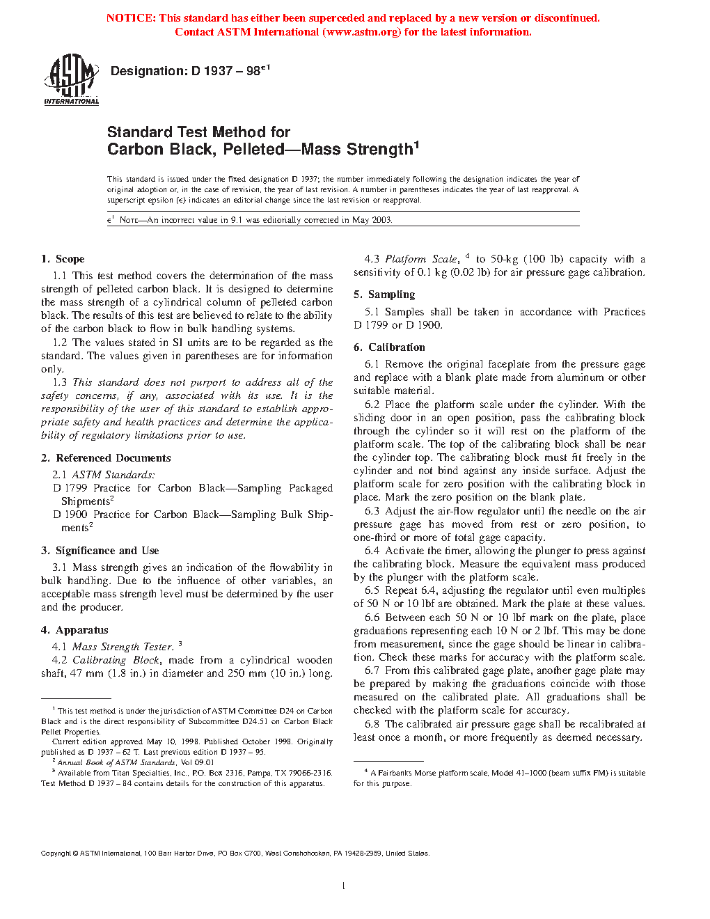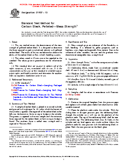 1.1 This test method covers the determination of the mass strength of pelleted carbon black. It is designed to determine the force required to pack a cylindrical column with pelleted carbon black. The results of this test are believed to relate to the ability of the carbon black to flow in bulk handling systems.