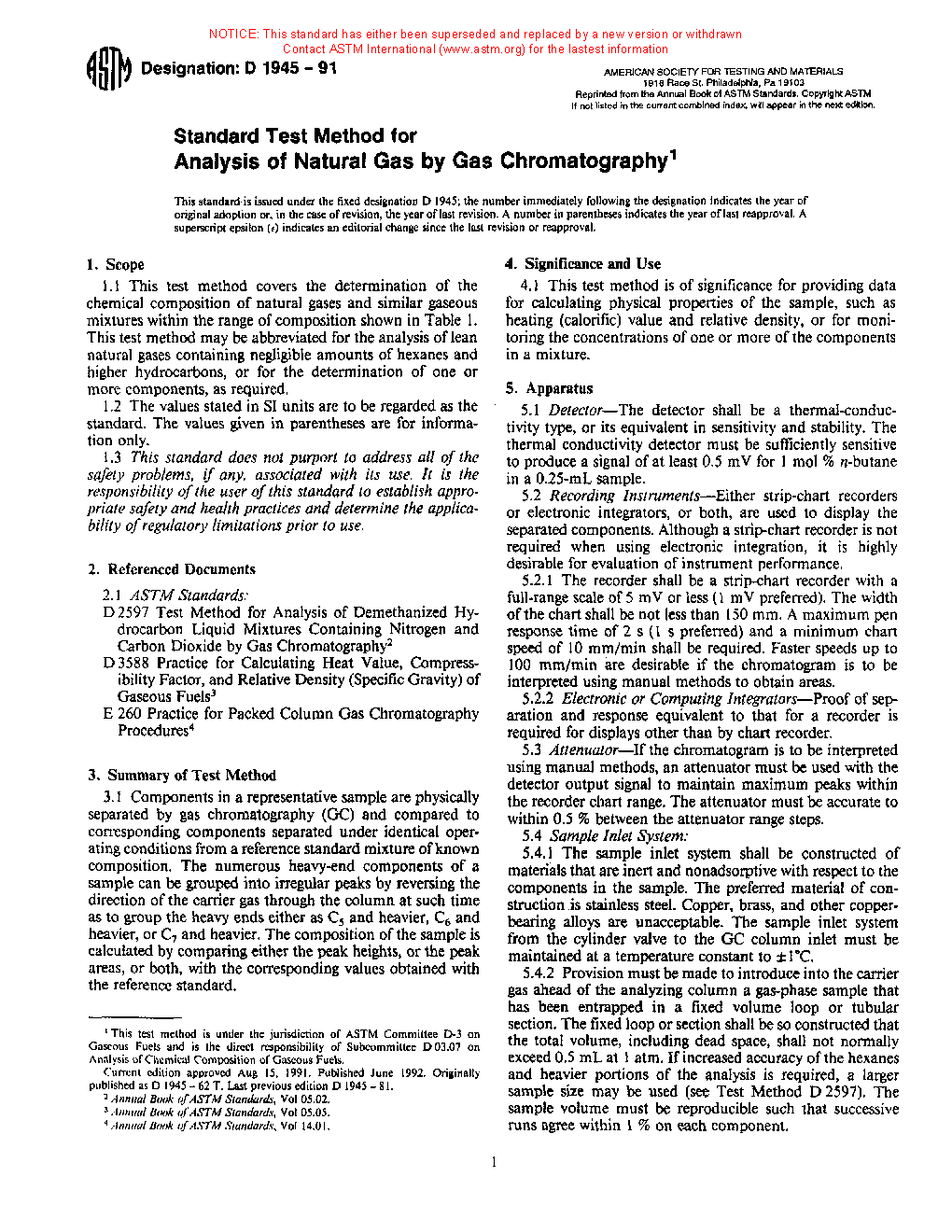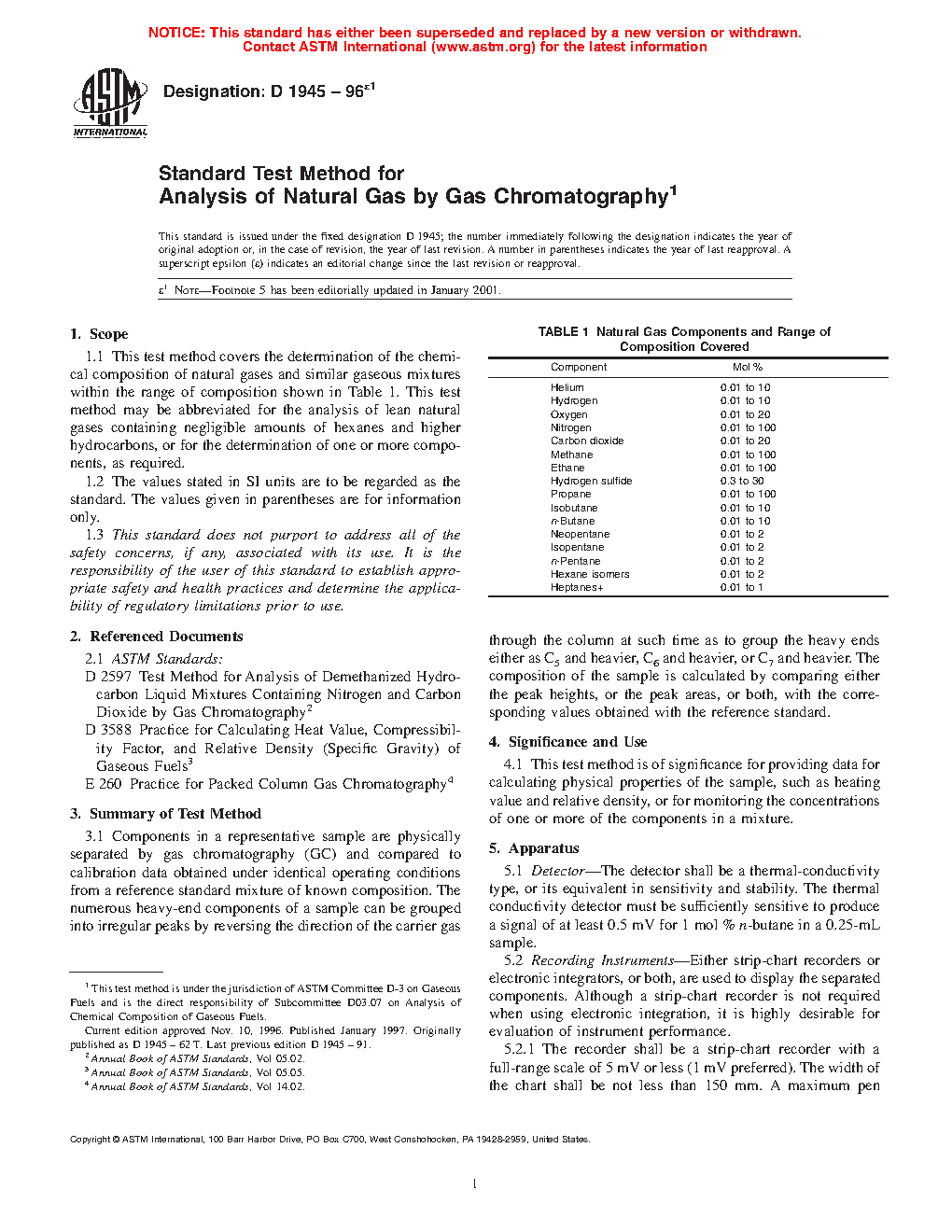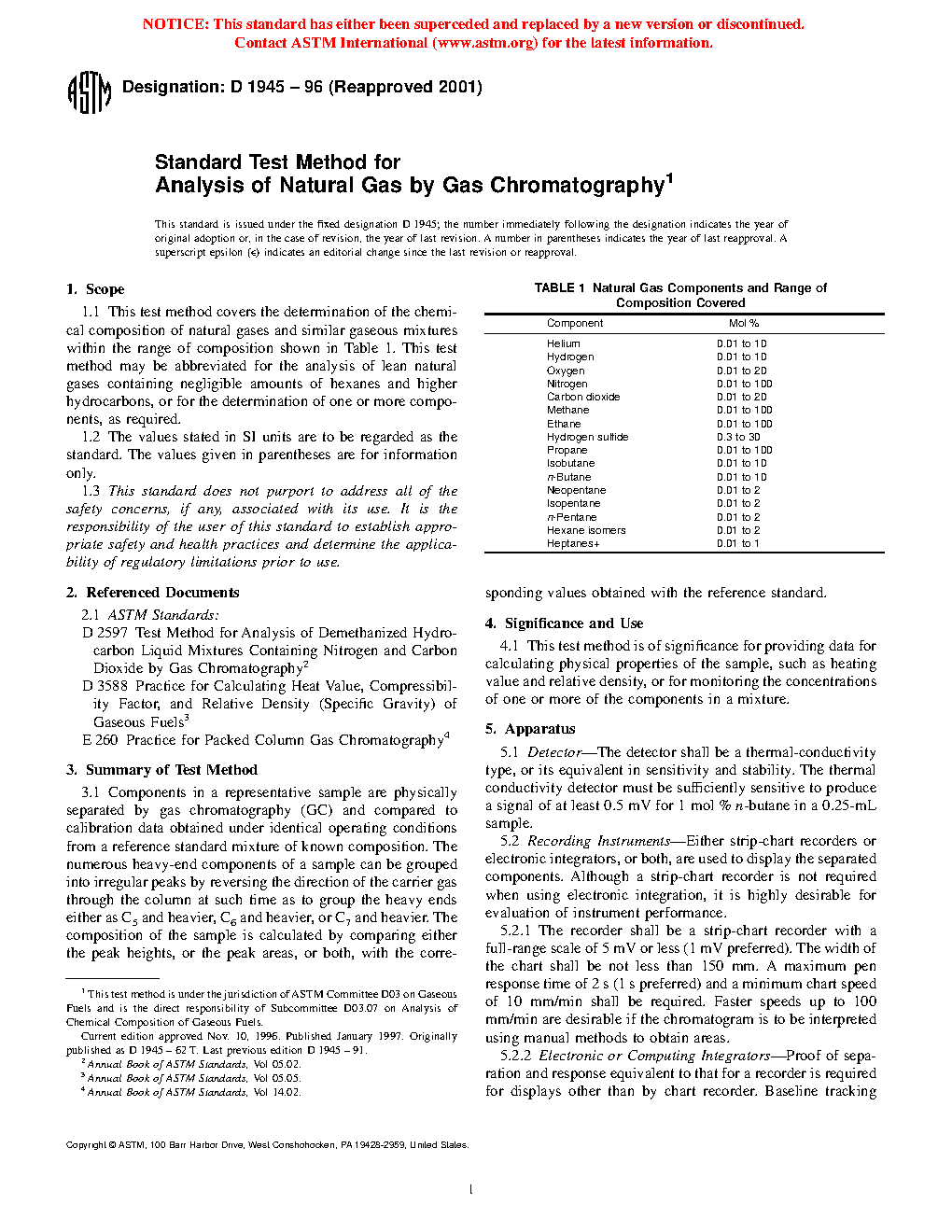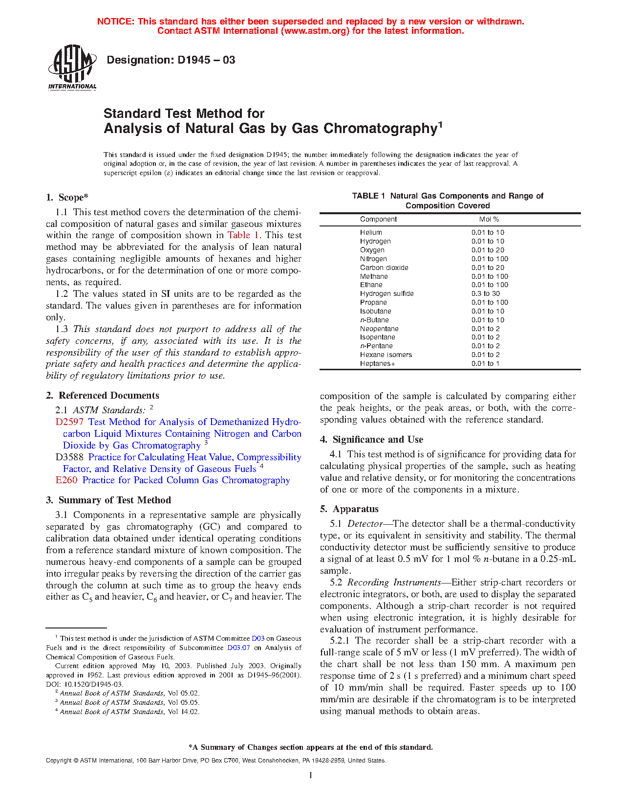 1.1 This test method covers the determination of the chemical composition of natural gases and similar gaseous mixtures within the range of composition shown in Table 1. This test method may be abbreviated for the analysis of lean natural gases containing negligible amounts of hexanes and higher hydrocarbons, or for the determination of one or more components, as required.
