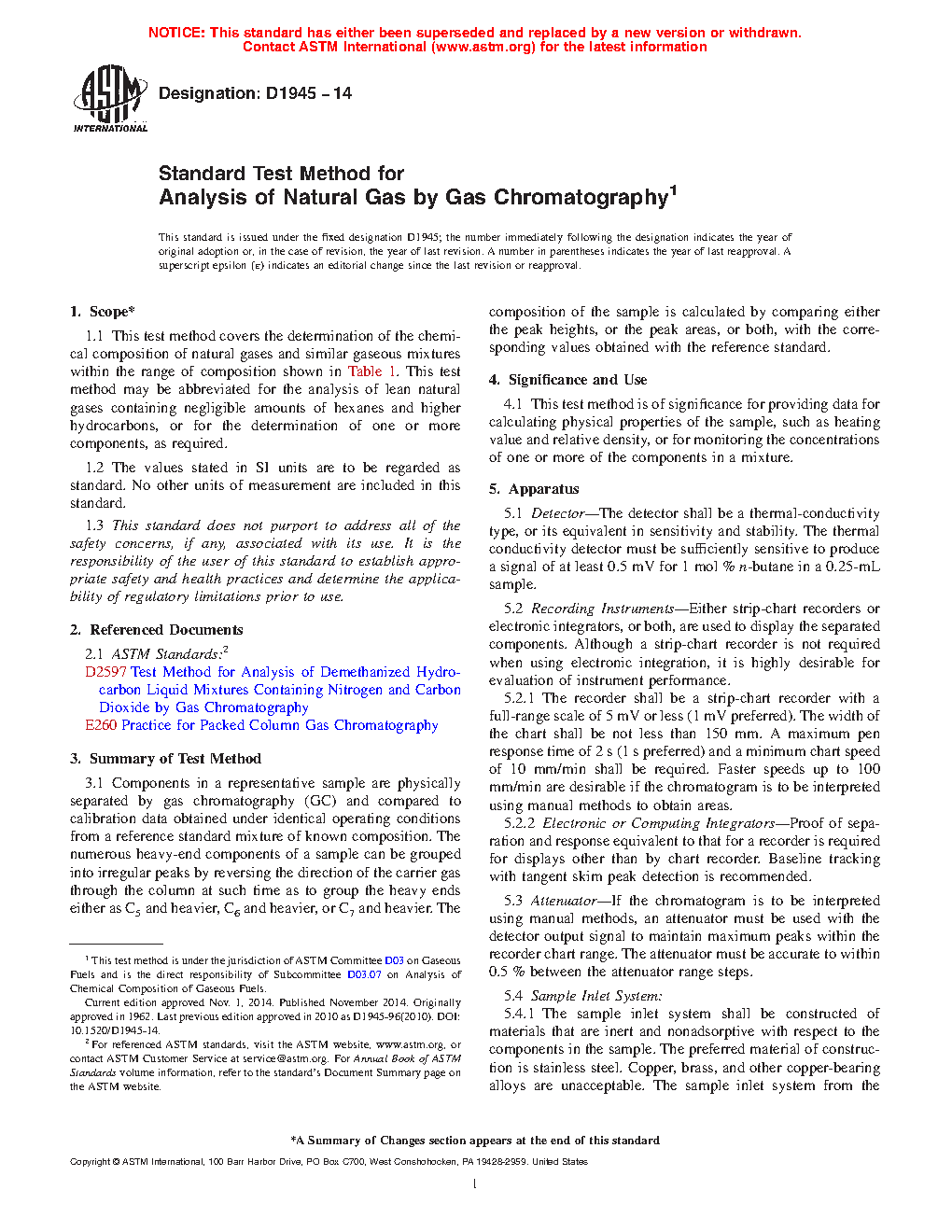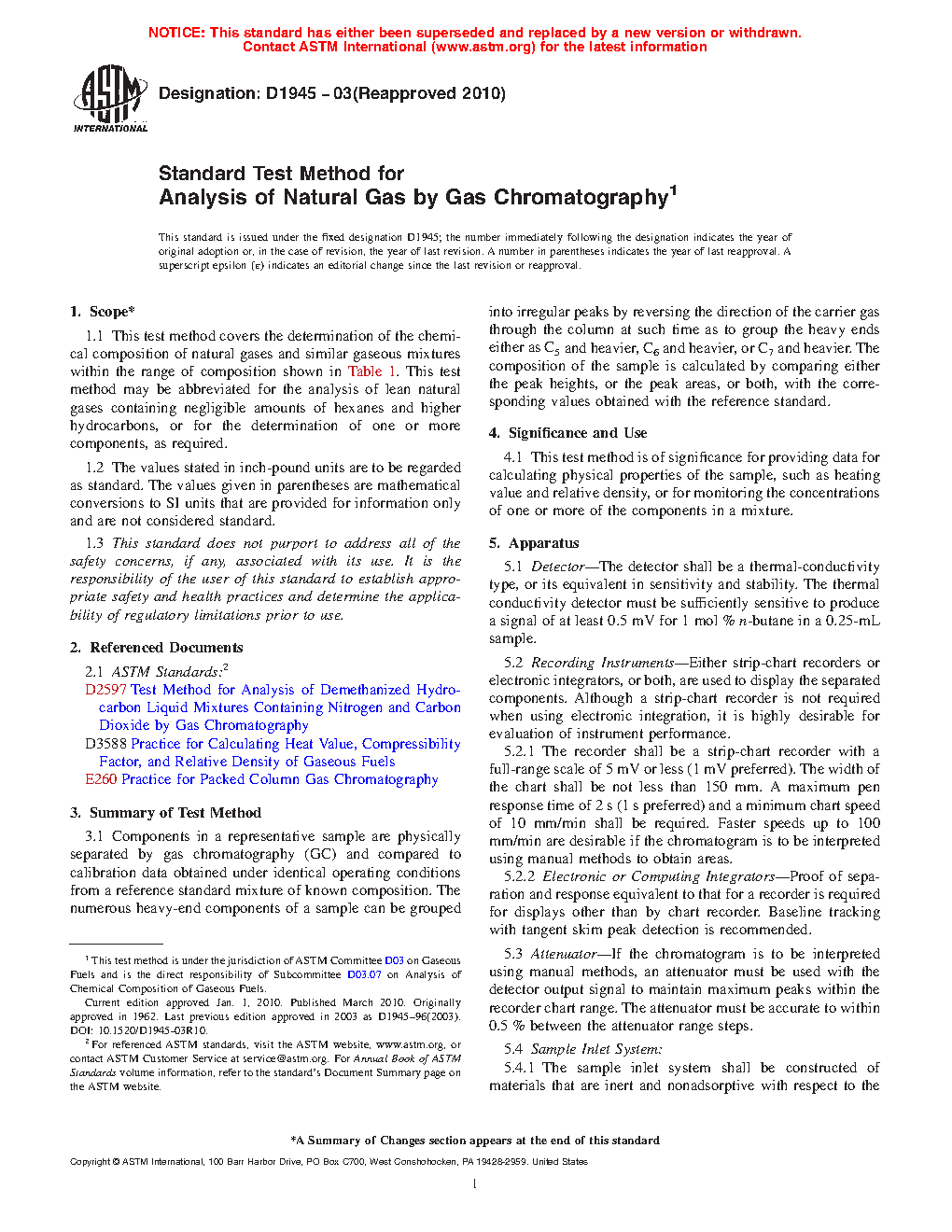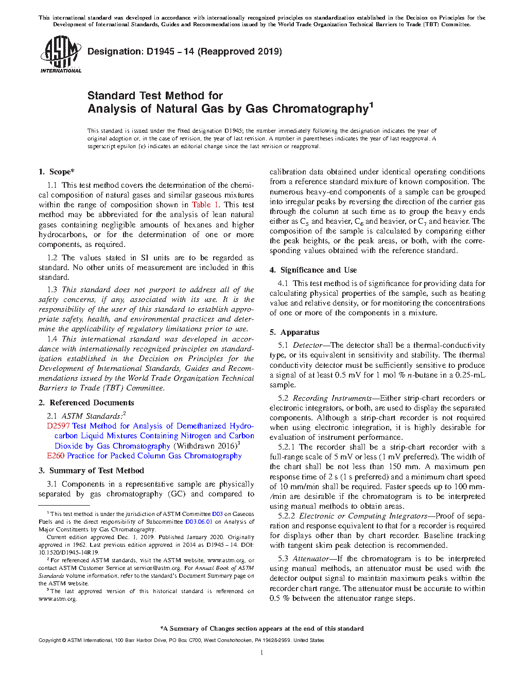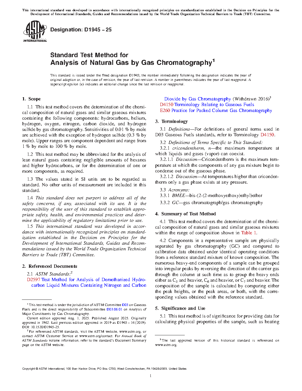 1.1 This test method covers the determination of the chemical composition of natural gases and similar gaseous mixtures within the range of composition shown in Table 1. This test method may be abbreviated for the analysis of lean natural gases containing negligible amounts of hexanes and higher hydrocarbons, or for the determination of one or more components, as required.