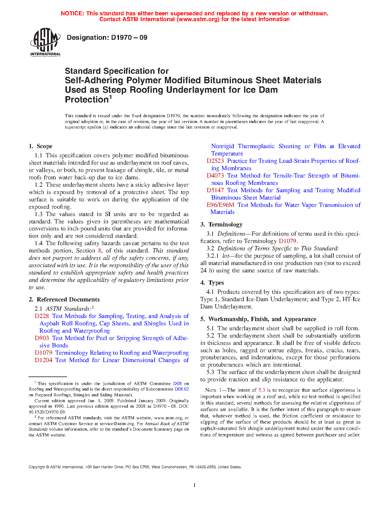 1.1 This specification covers polymer modified bituminous sheet materials intended for use as underlayment on roof eaves, or valleys, or both, to prevent leakage of shingle, tile, or metal roofs from water back-up due to ice dams.