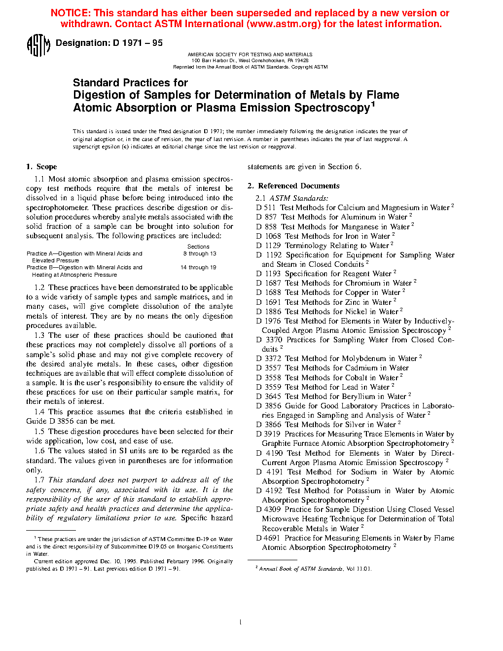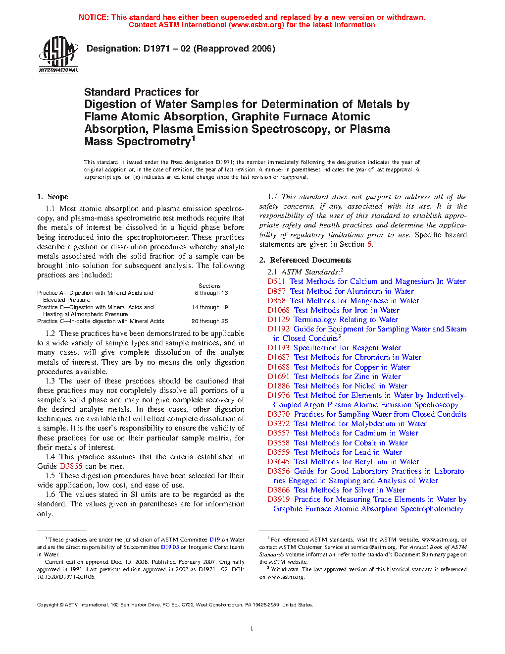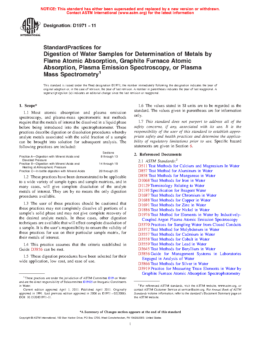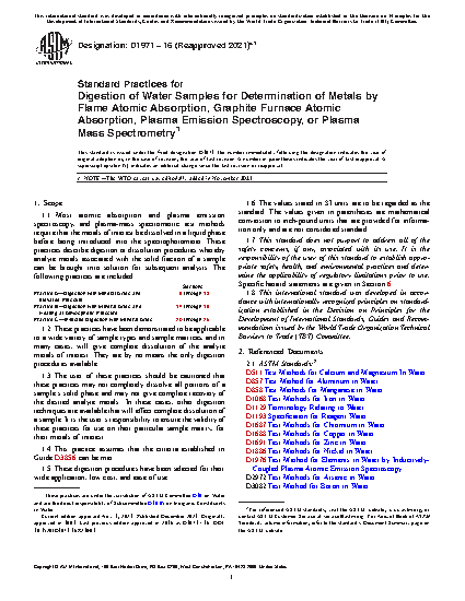 1.1 Most atomic absorption and plasma emission spectroscopy, and plasma-mass spectrometric test methods require that the metals of interest be dissolved in a liquid phase before being introduced into the spectrophotometer. These practices describe digestion or dissolution procedures whereby analyte metals associated with the solid fraction of a sample can be brought into solution for subsequent analysis. The following practices are included: