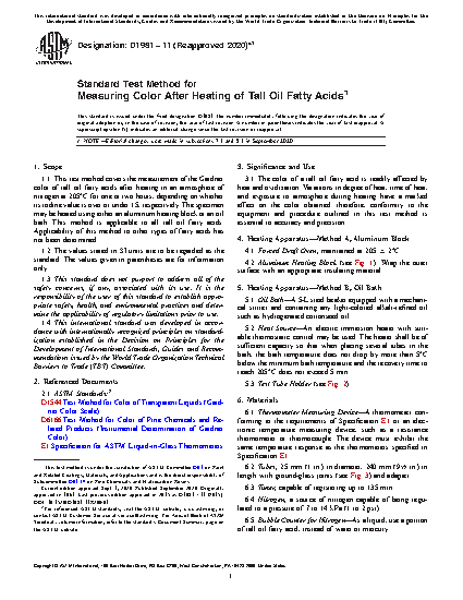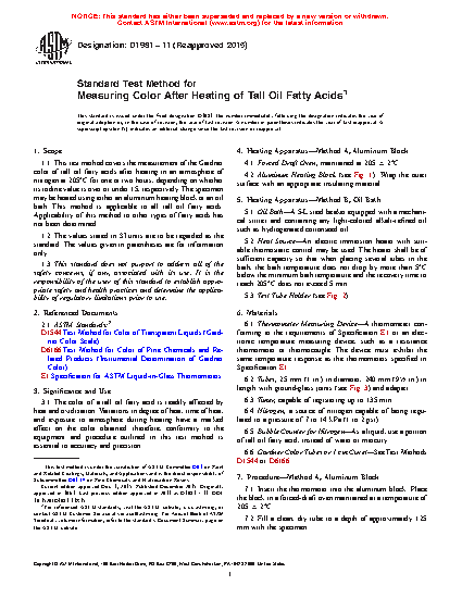 1.1 This test method covers the measurement of the Gardner color of tall oil fatty acids after heating in an atmosphere of nitrogen at 205°C for one or two hours, depending on whether its iodine value is over or under 15, respectively. The specimen may be heated using either an aluminum heating block or an oil bath. This method is applicable to all tall oil fatty acids. Applicability of this method to other types of fatty acids has not been determined.