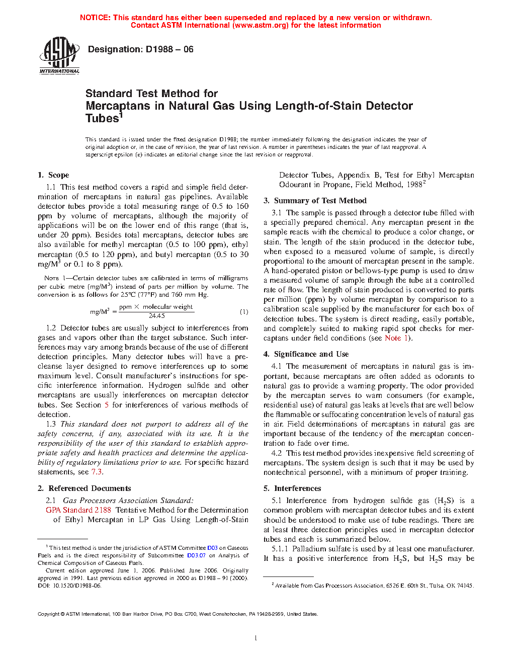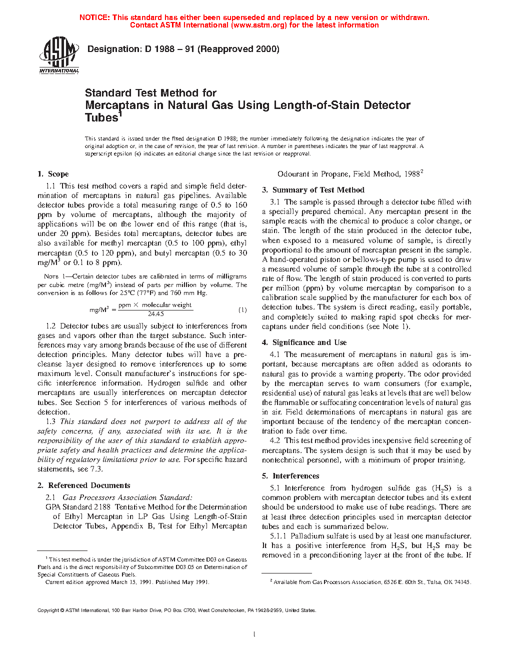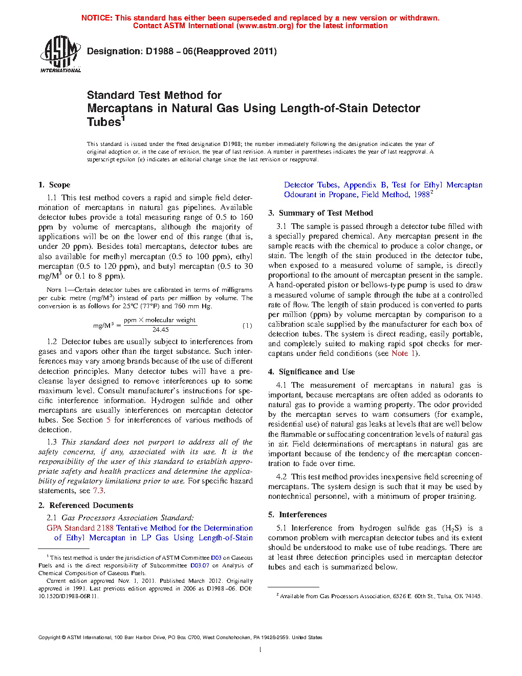 1.1 This test method covers a rapid and simple field determination of mercaptans in natural gas pipelines. Available detector tubes provide a total measuring range of 0.5 to 160 ppm by volume of mercaptans, although the majority of applications will be on the lower end of this range (that is, under 20 ppm). Besides total mercaptans, detector tubes are also available for methyl mercaptan (0.5 to 100 ppm), ethyl mercaptan (0.5 to 120 ppm), and butyl mercaptan (0.5 to 30 mg/M3 or 0.1 to 8 ppm).