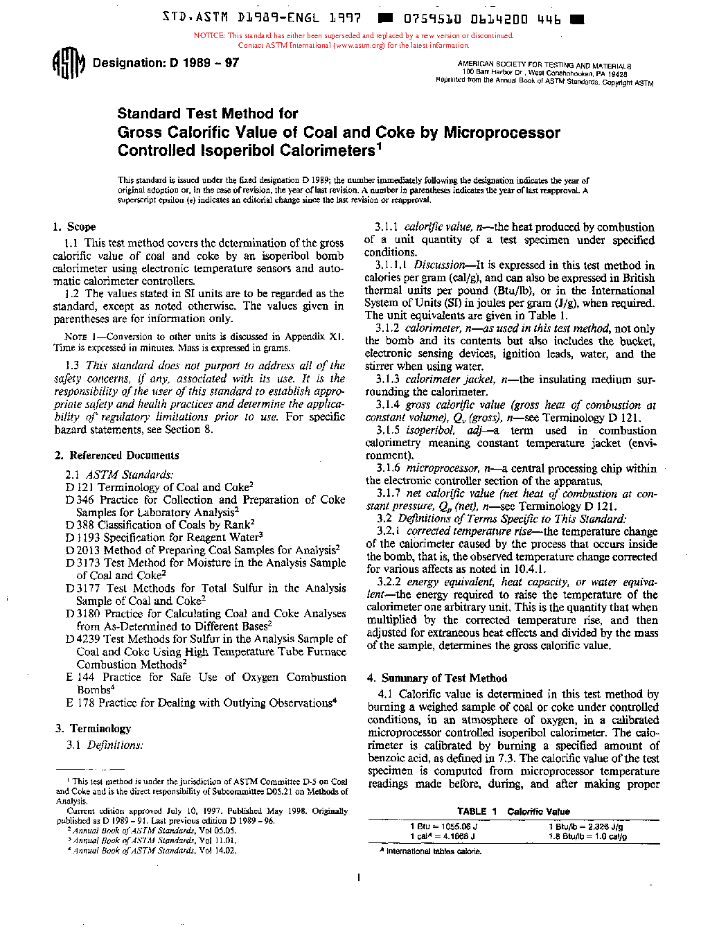 Standard Test Method for Gross Calorific Value of Coal and Coke by Microprocessor Controlled Isoperibol Calorimeters (Withdrawn 2000)
