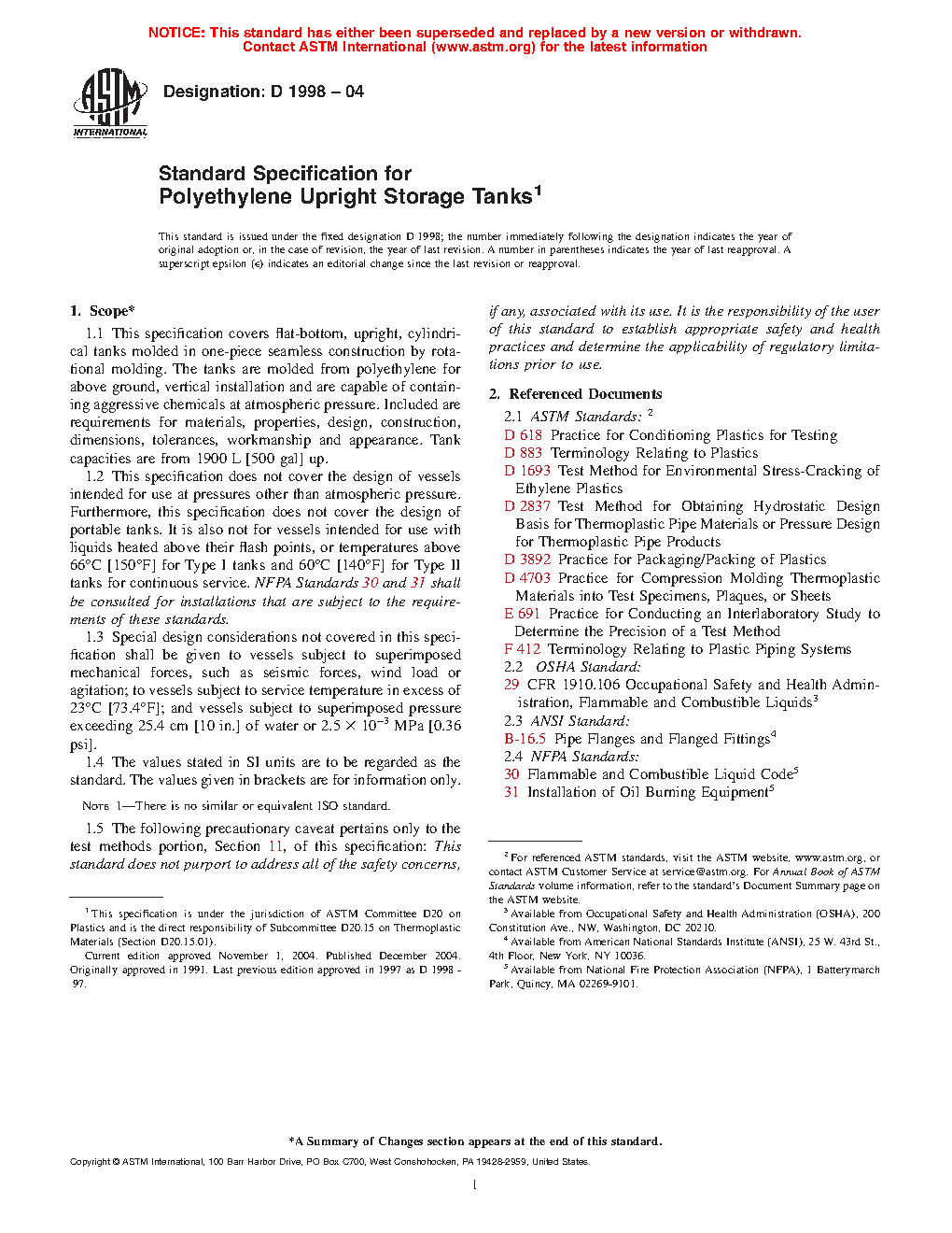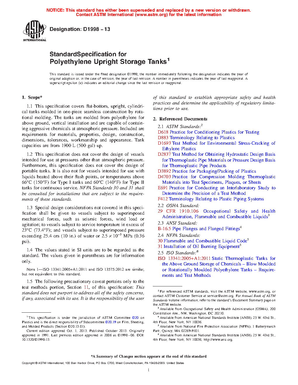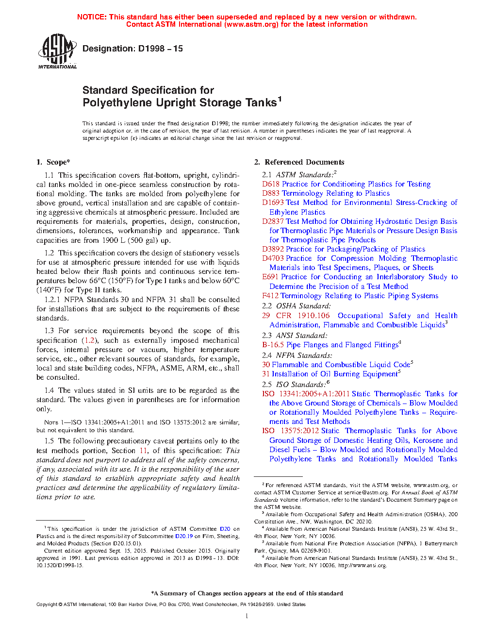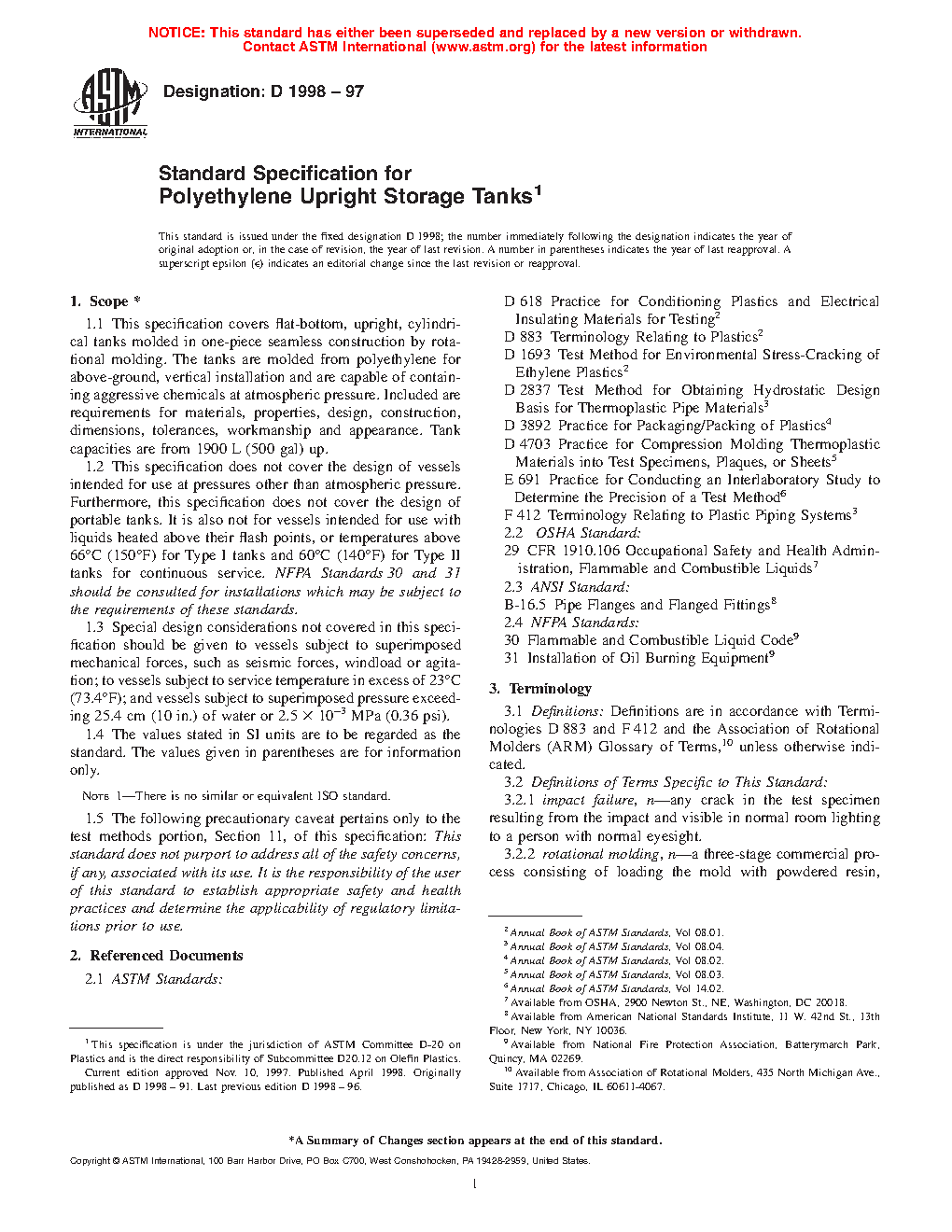 1.1 This specification covers flat-bottom, upright, cylindrical tanks molded in one-piece seamless construction by rotational molding. The tanks are molded from polyethylene for above-ground, vertical installation and are capable of containing aggressive chemicals at atmospheric pressure. Included are requirements for materials, properties, design, construction, dimensions, tolerances, workmanship and appearance. Tank capacities are from 1900 L (500 gal) up.