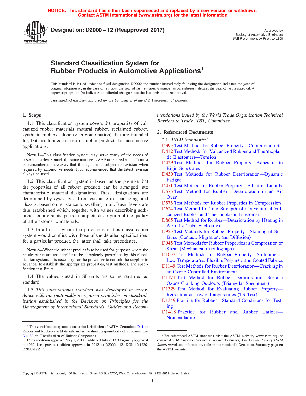 1.1 This classification system tabulates the properties of vulcanized rubber materials (natural rubber, reclaimed rubber, synthetic rubbers, alone or in combination) that are intended for, but not limited to, use in rubber products for automotive applications. Note 1This classification system may serve many of the needs of other industries in much the same manner as SAE numbered steels. It must be remembered, however, that this system is subject to revision when required by automotive needs. It is recommended that the latest revision always be used.