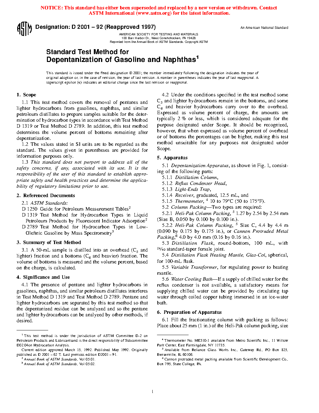 1.1 This test method covers the removal of pentanes and lighter hydrocarbons from gasolines, naphthas, and similar petroleum distillates to prepare samples suitable for the determination of hydrocarbon types in accordance with Test Method D 1319 or Test Method D 2789. In addition, this test method determines the volume percent of bottoms remaining after depentanization.