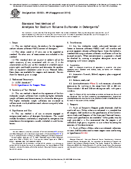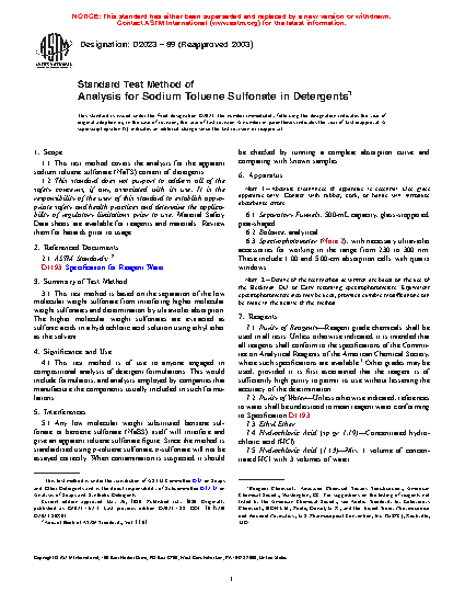 1.1 This test method covers the analysis for the apparent sodium toluene sulfonate (NaTS) content of detergents.