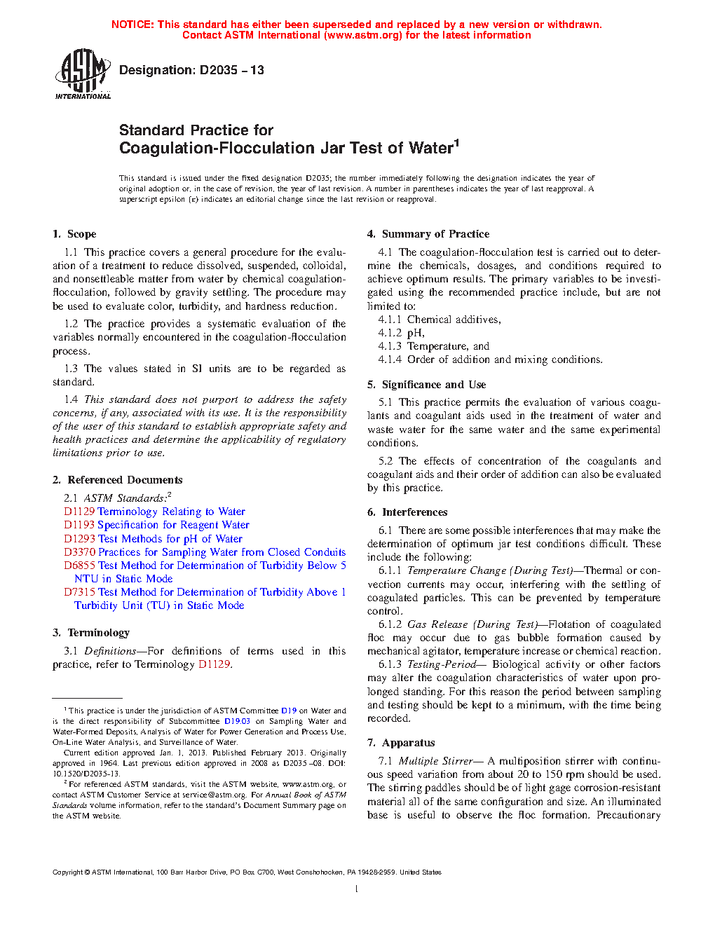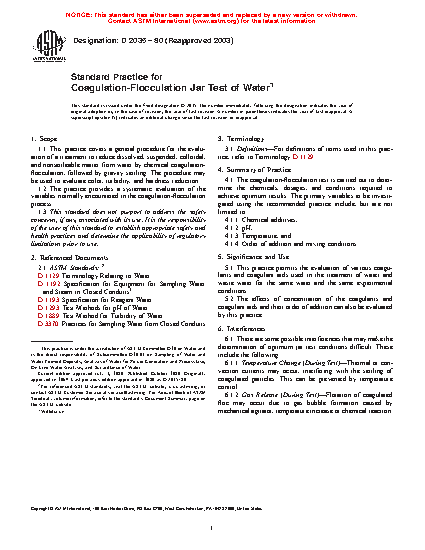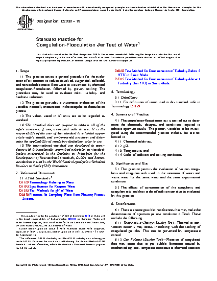 Standard Practice for Coagulation-Flocculation Jar Test of Water