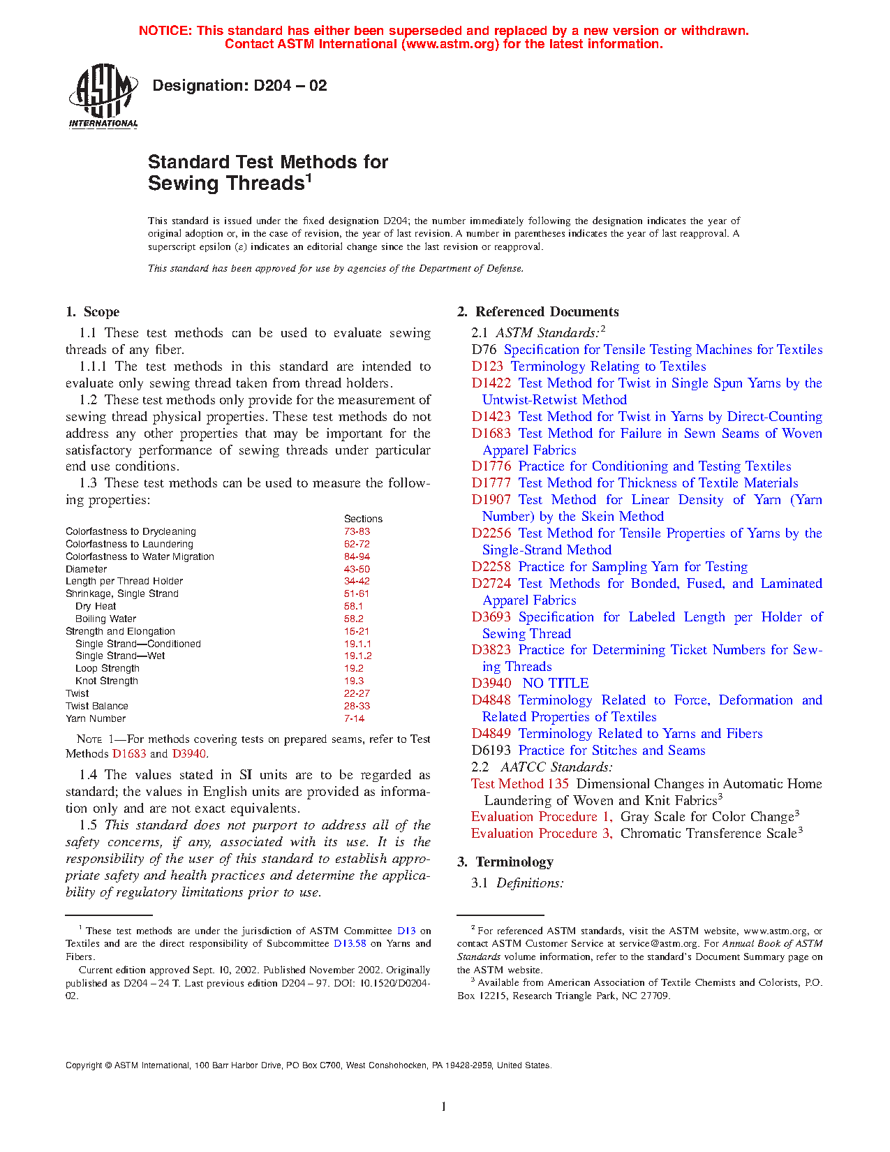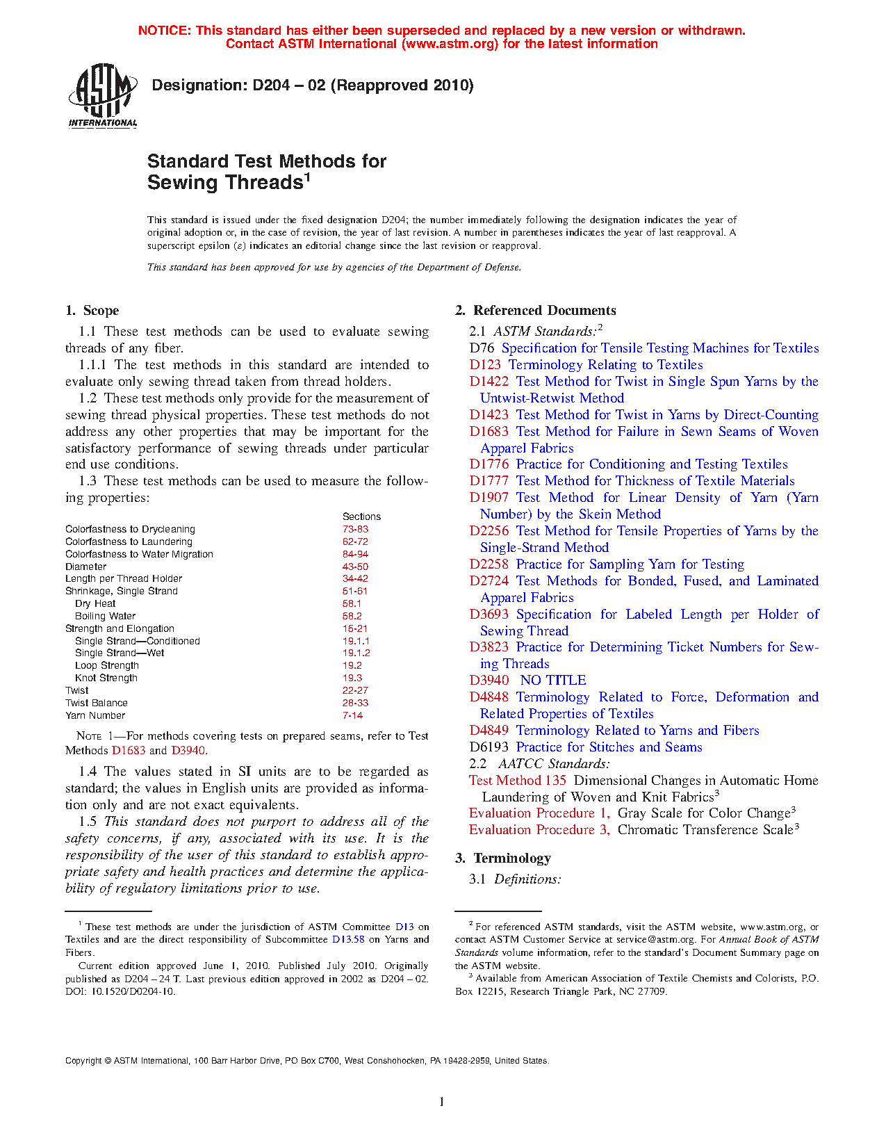 4.1 Acceptance Testing—The test methods in Test Methods D204 for the determination of the properties of sewing thread are considered satisfactory for acceptance testing of commercial shipments of sewing thread, unless specified in the individual test method. These test methods are the best available and are used extensively in the trade.