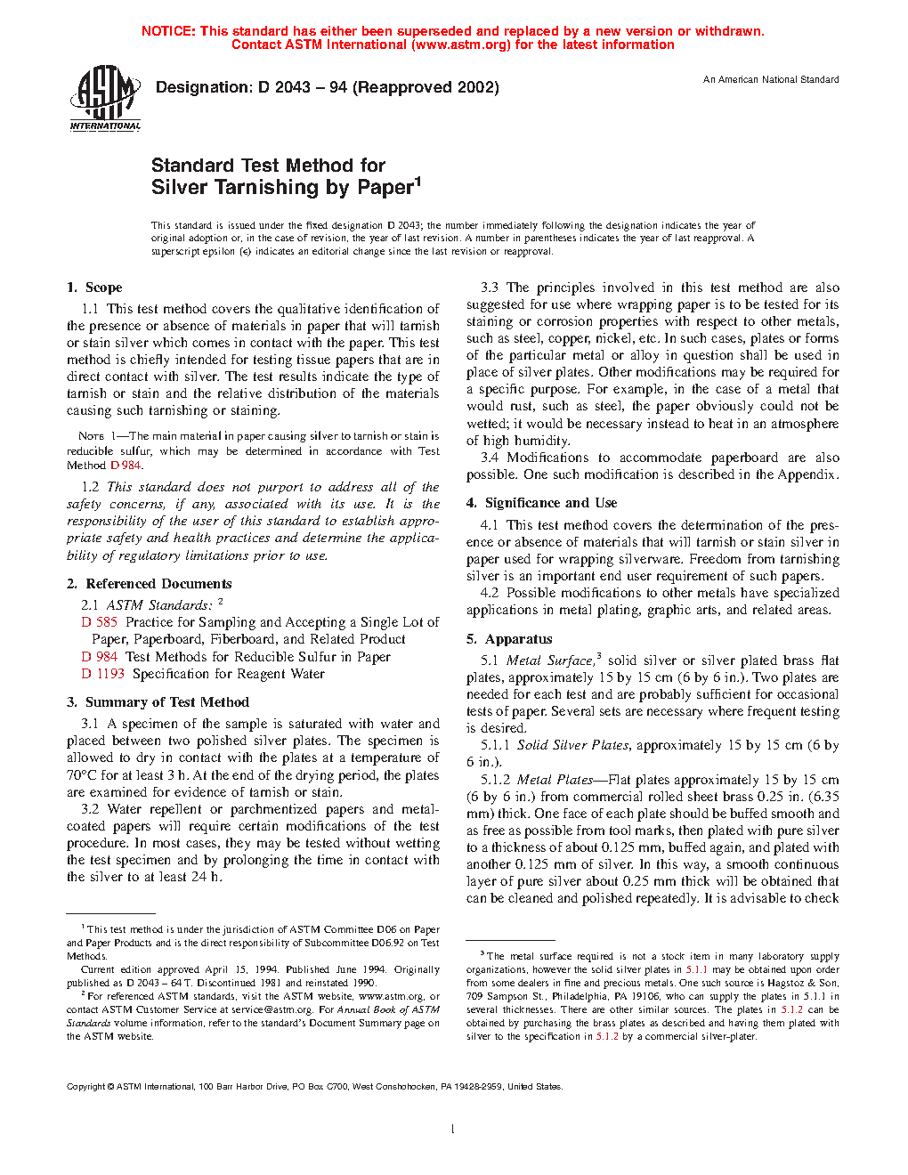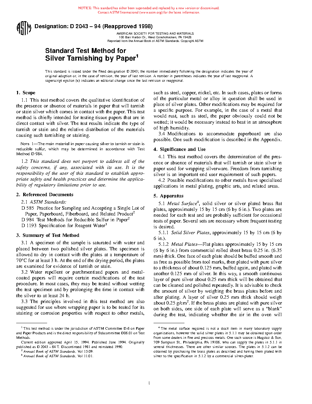 Note 1-The main material in paper causing silver to tarnish or stain is reducible sulfur, which may be determined in accordance with Test Method D984.1.2 This standard does not purport to address all of the safety concerns, if any, associated with its use. It is the responsibility of the user of this standard to establish appropriate safety and health practices and determine the applicability of regulatory limitations prior to use.