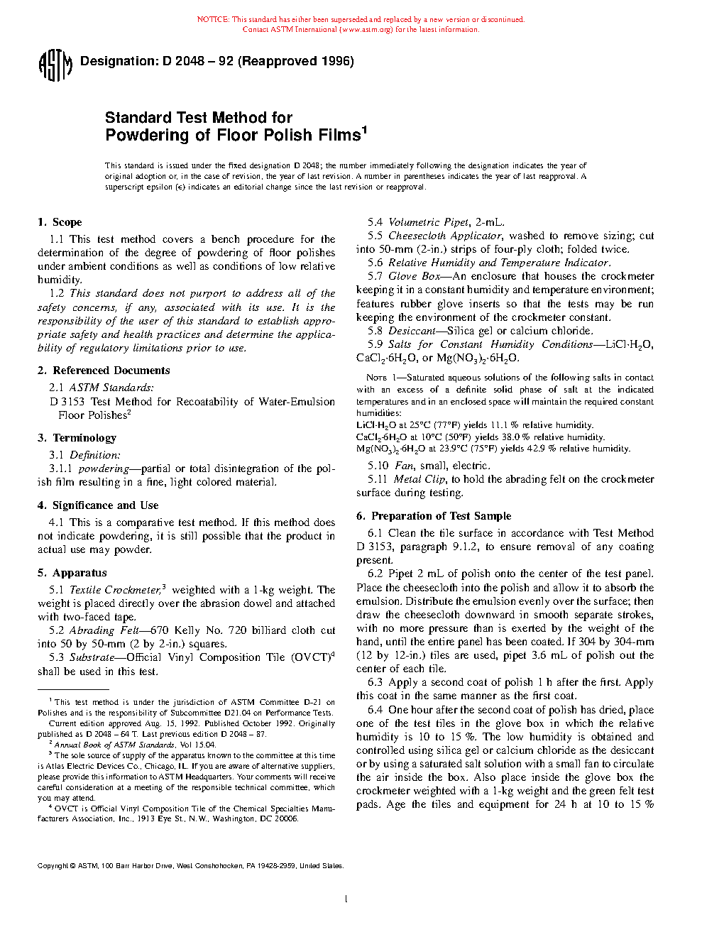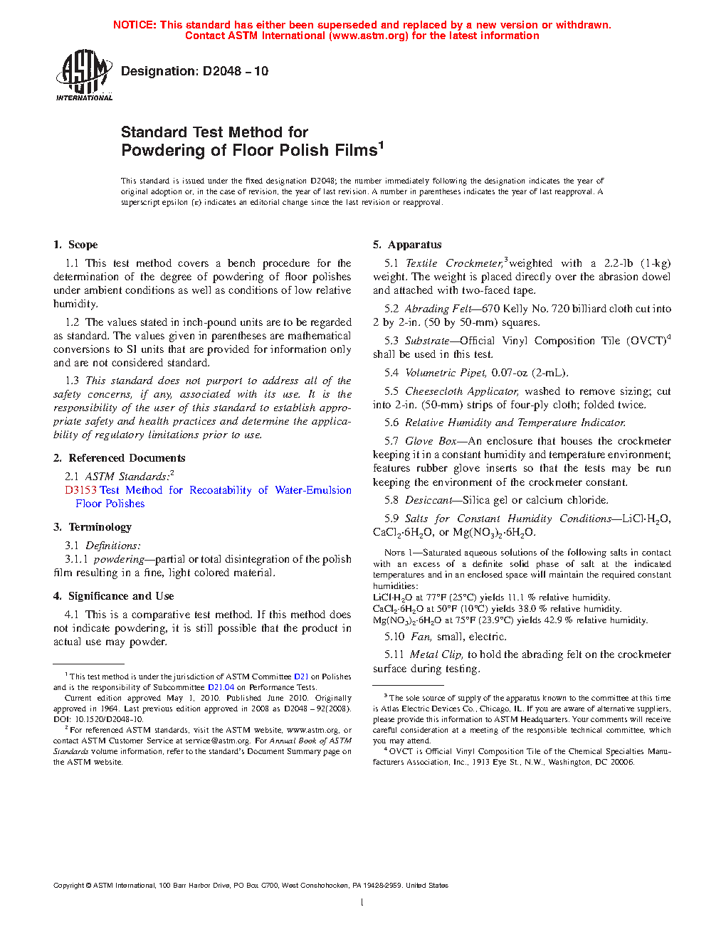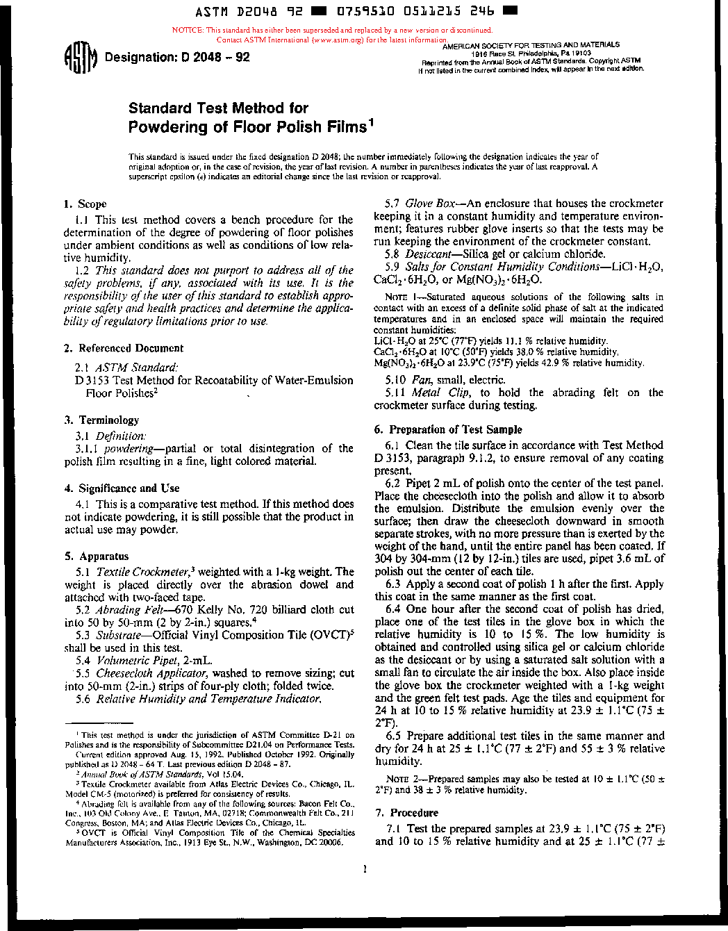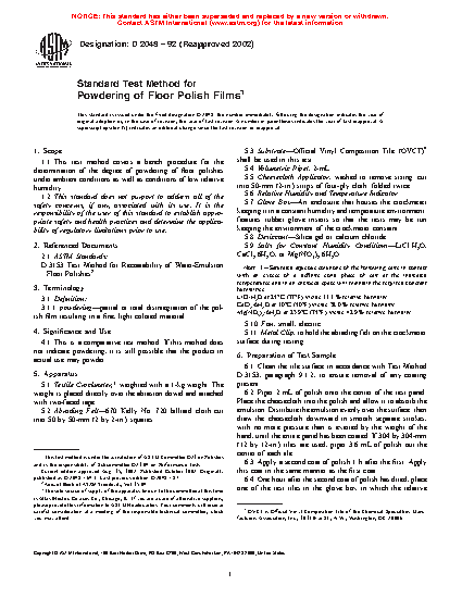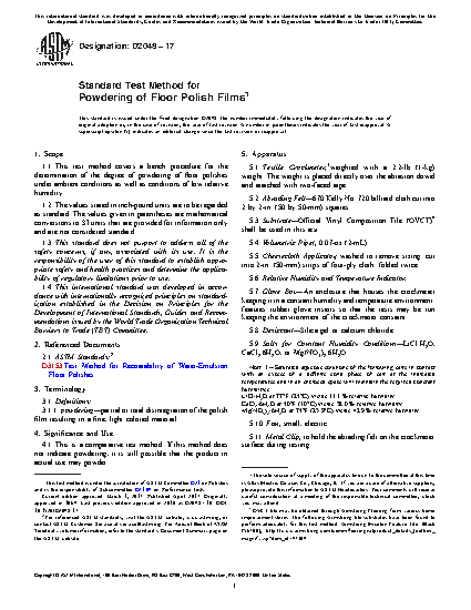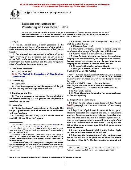 1.1 This test method covers a bench procedure for the determination of the degree of powdering of floor polishes under ambient conditions as well as conditions of low relative humidity.