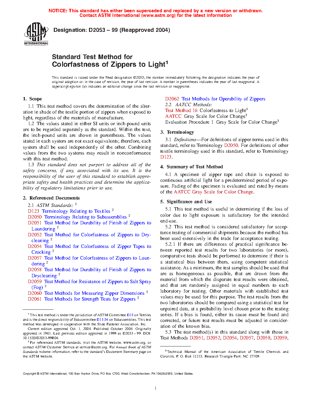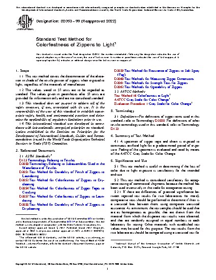 1.1 This test method covers the determination of the alteration in shade of the textile portion of zippers when exposed to light, regardless of the materials of manufacture.